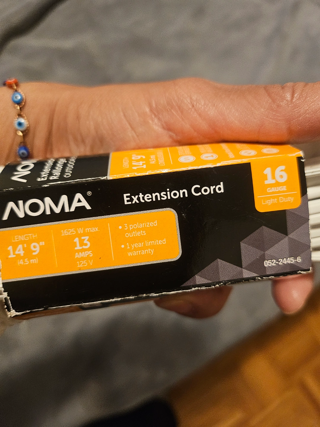 16 gauge light duty extension cord. 14.9 feet (4.5 m) long. Three polarized outlets. 13 amps, 125 V. One-year limited warranty.