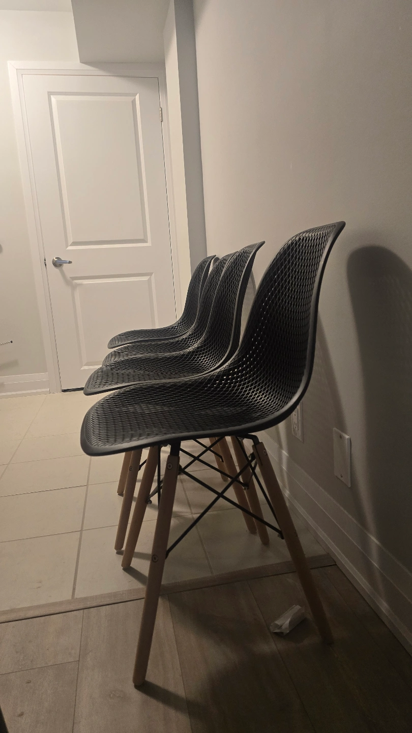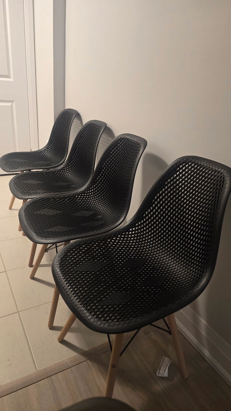 Four modern dining chairs. Black plastic seats and backs. Light brown wooden legs. Minimalist design. Good condition.