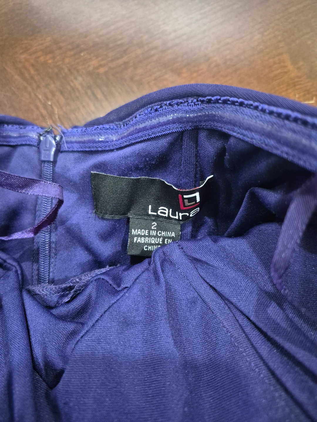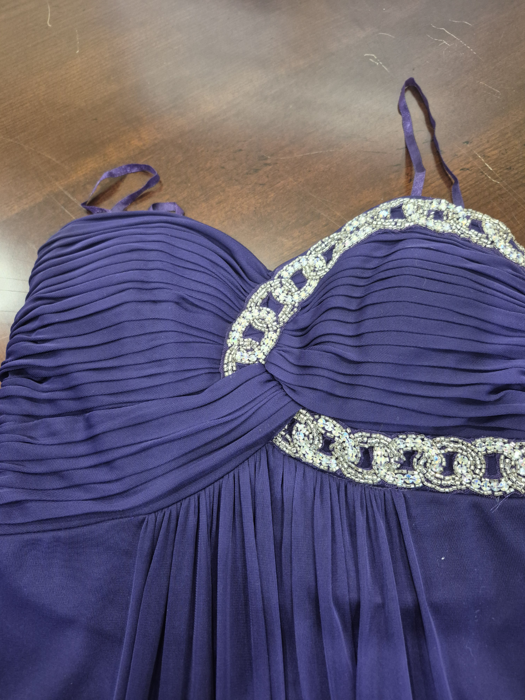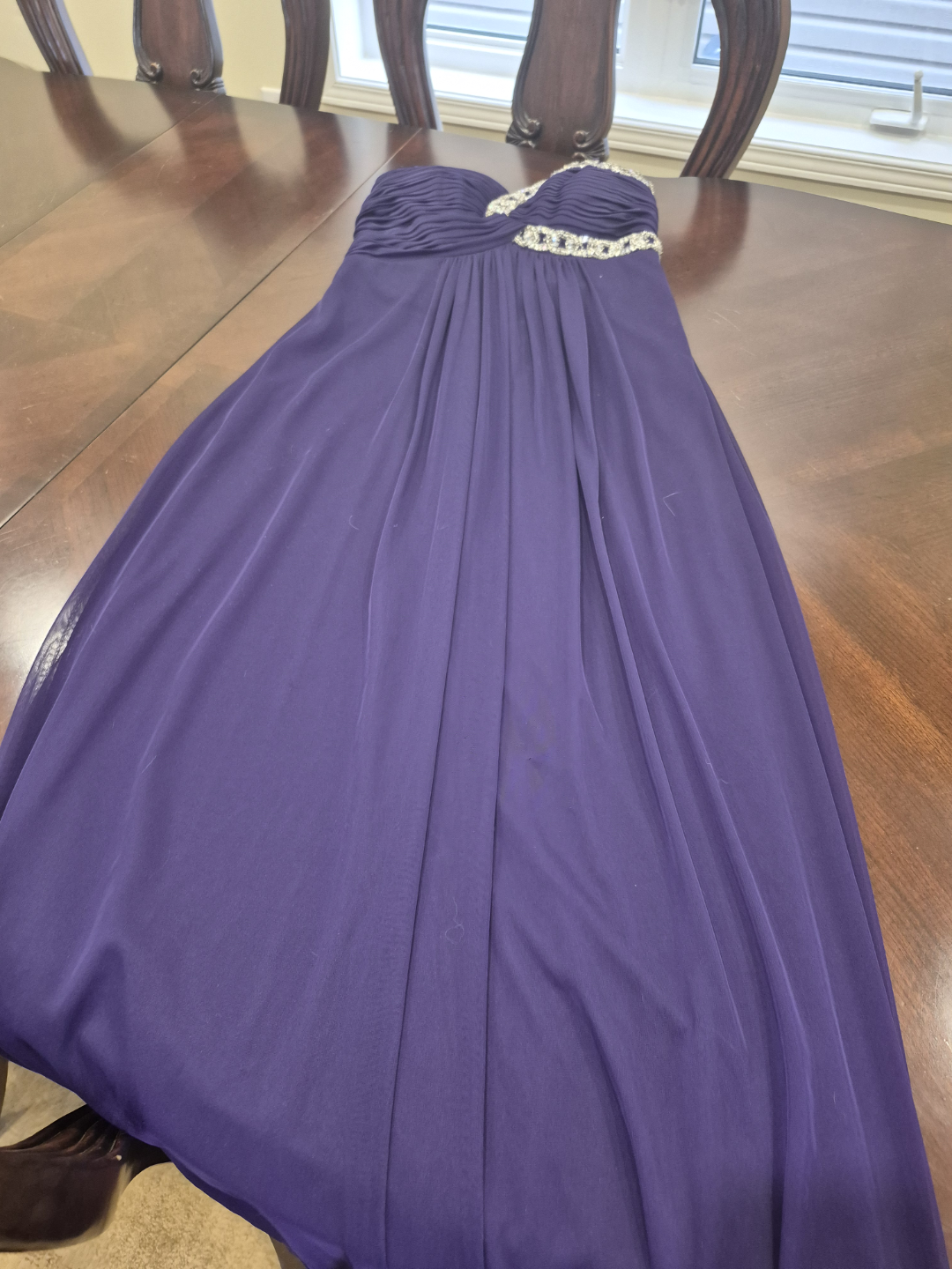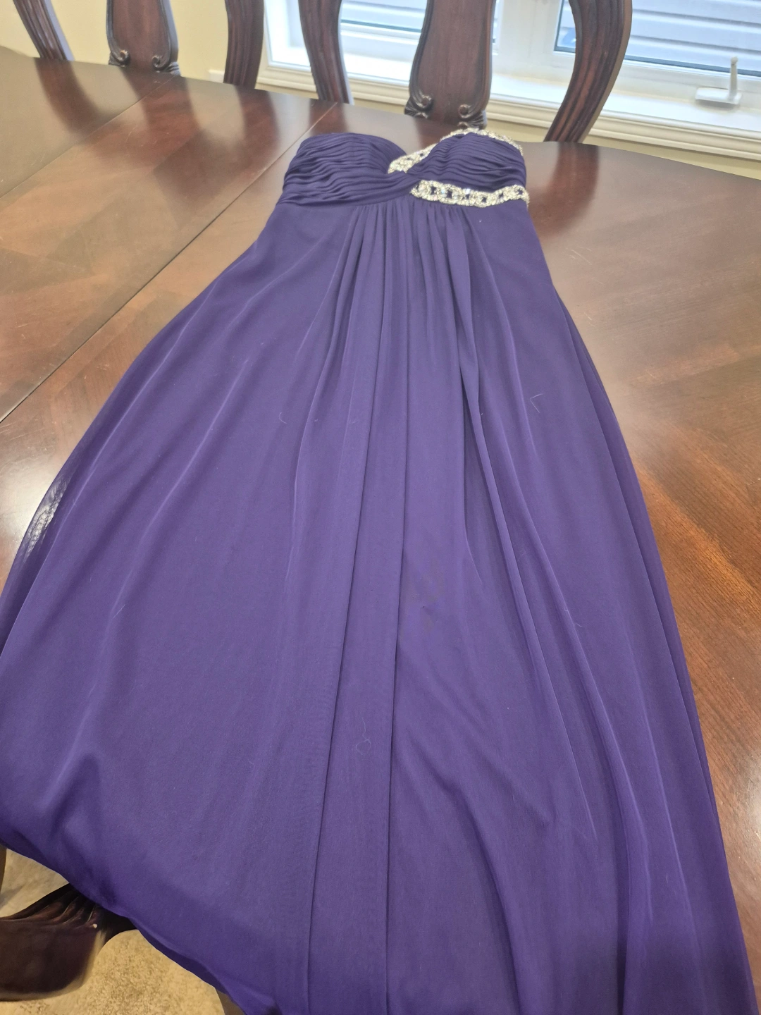 This is a strapless, floor-length evening or formal gown. It is a rich, deep purple color with a sweetheart neckline. The skirt is flowing and appears to be made from a lightweight, chiffon-like fabric that drapes nicely.