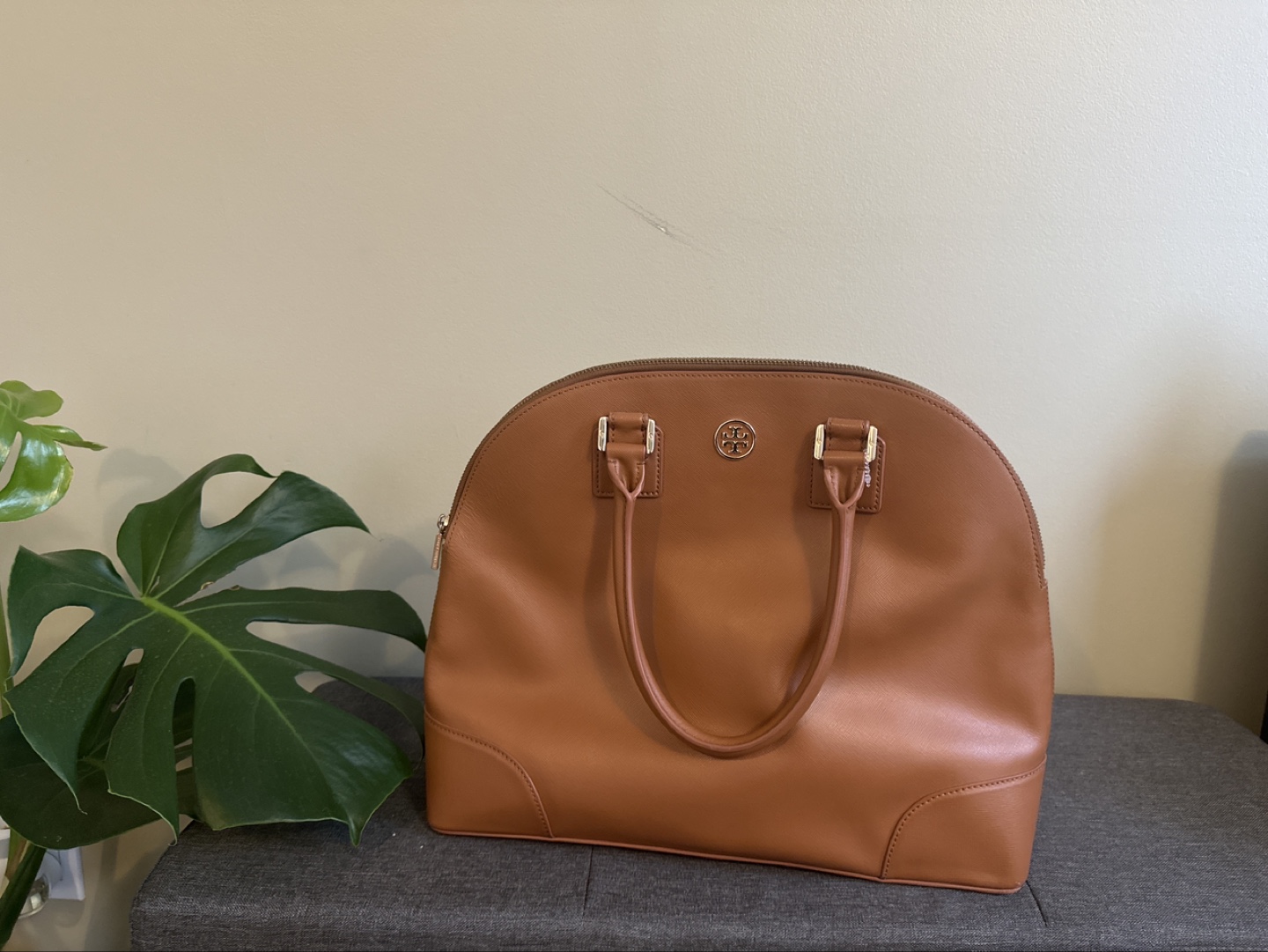 Tan/Brown leather satchel. Features double handles and zip closure. Gold-tone hardware. Excellent condition.