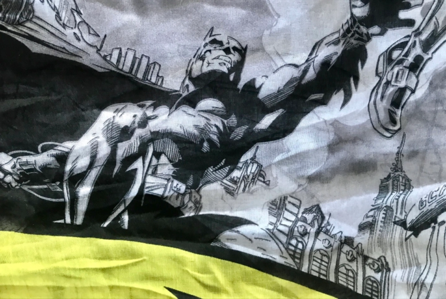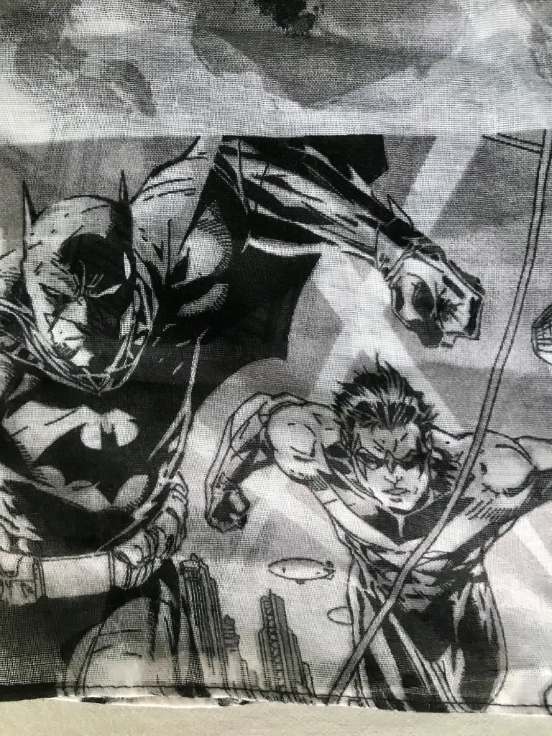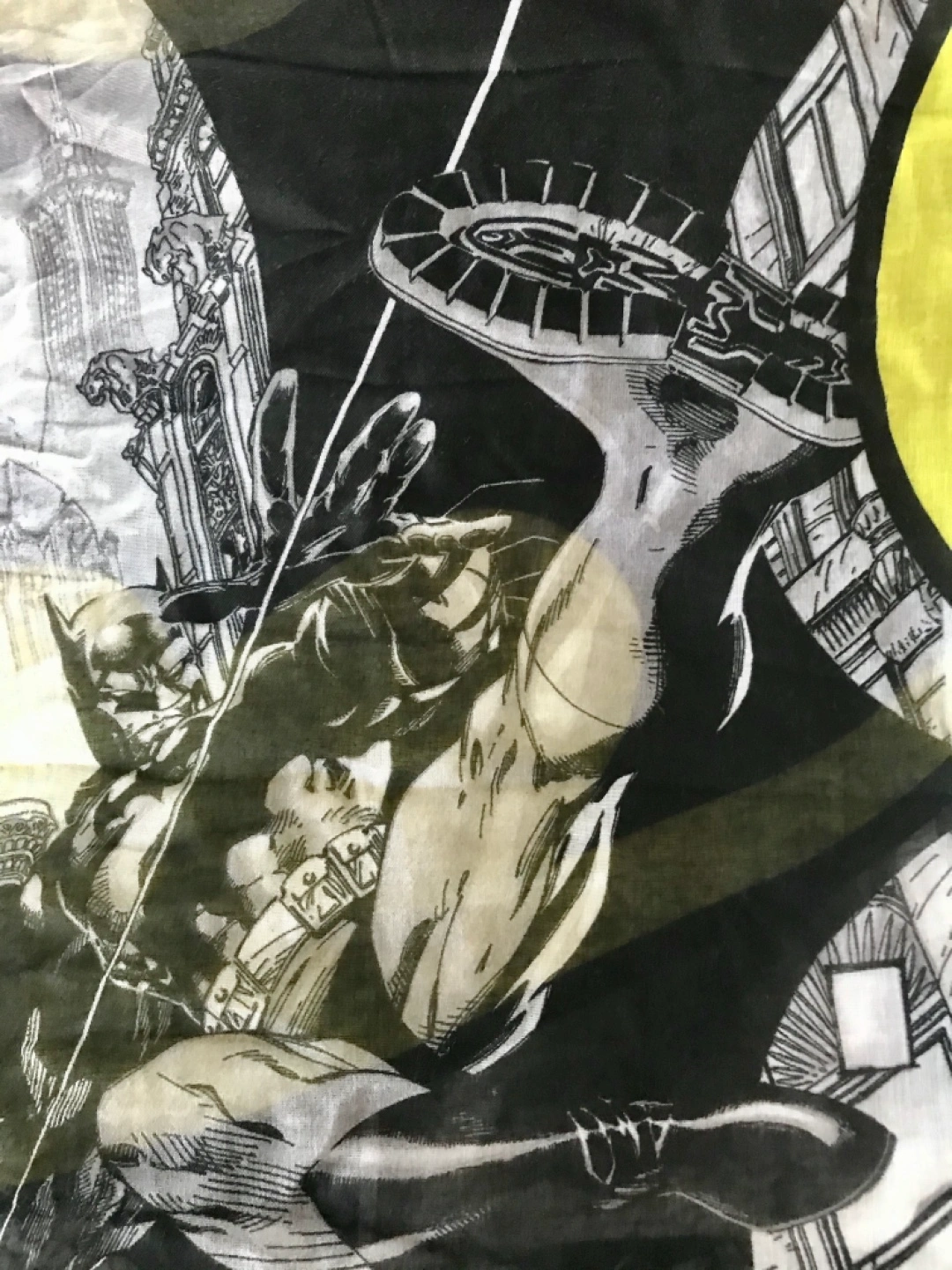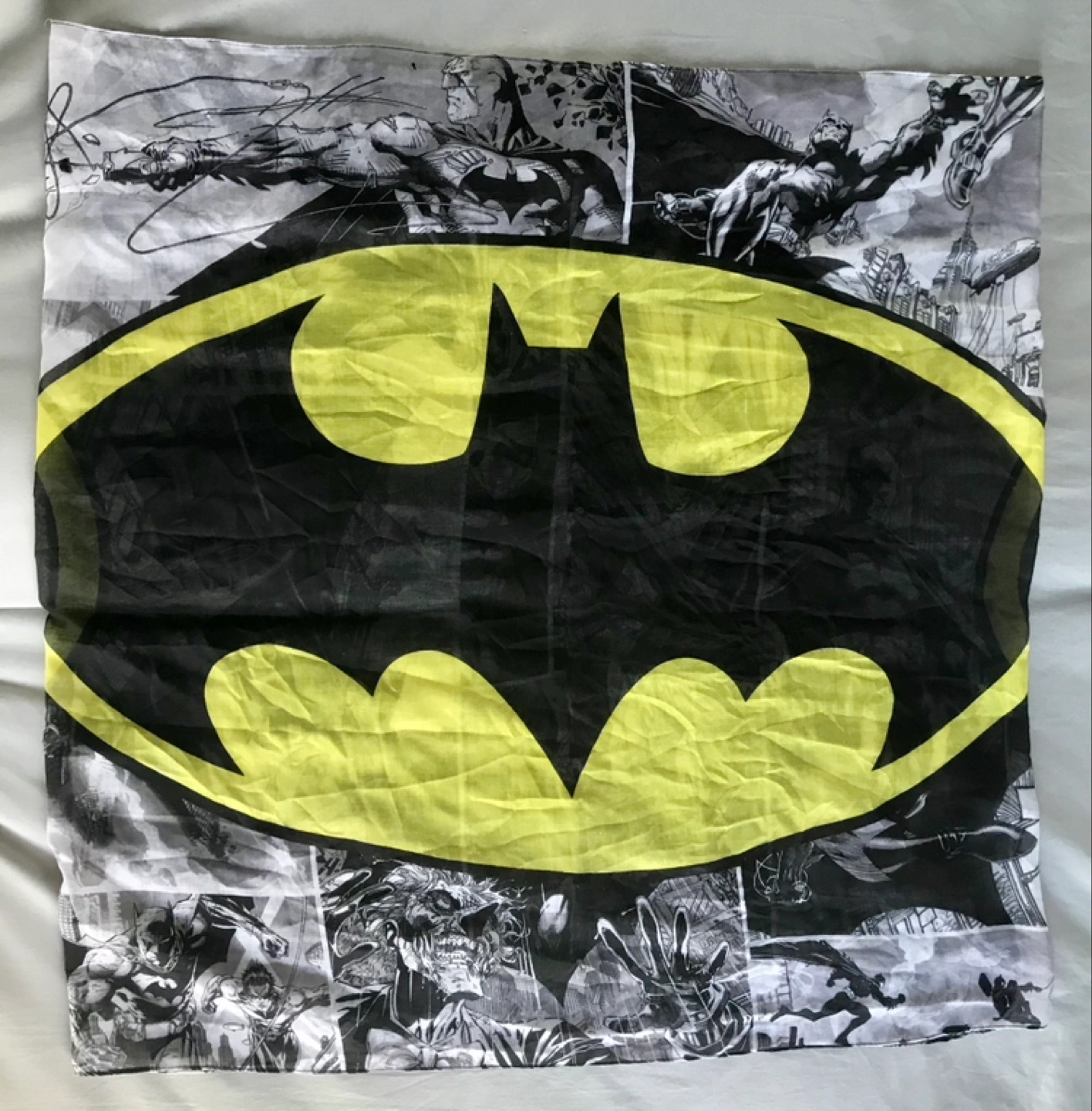 DC Comics Batman infinity scarf with amazing art by the legendary comic book artist Jim Lee. It is brand new with tags. It measures 34.5 inches by 35.5 inches. 100% polyester. This is a remarkable piece for any Batman or comic book fan.