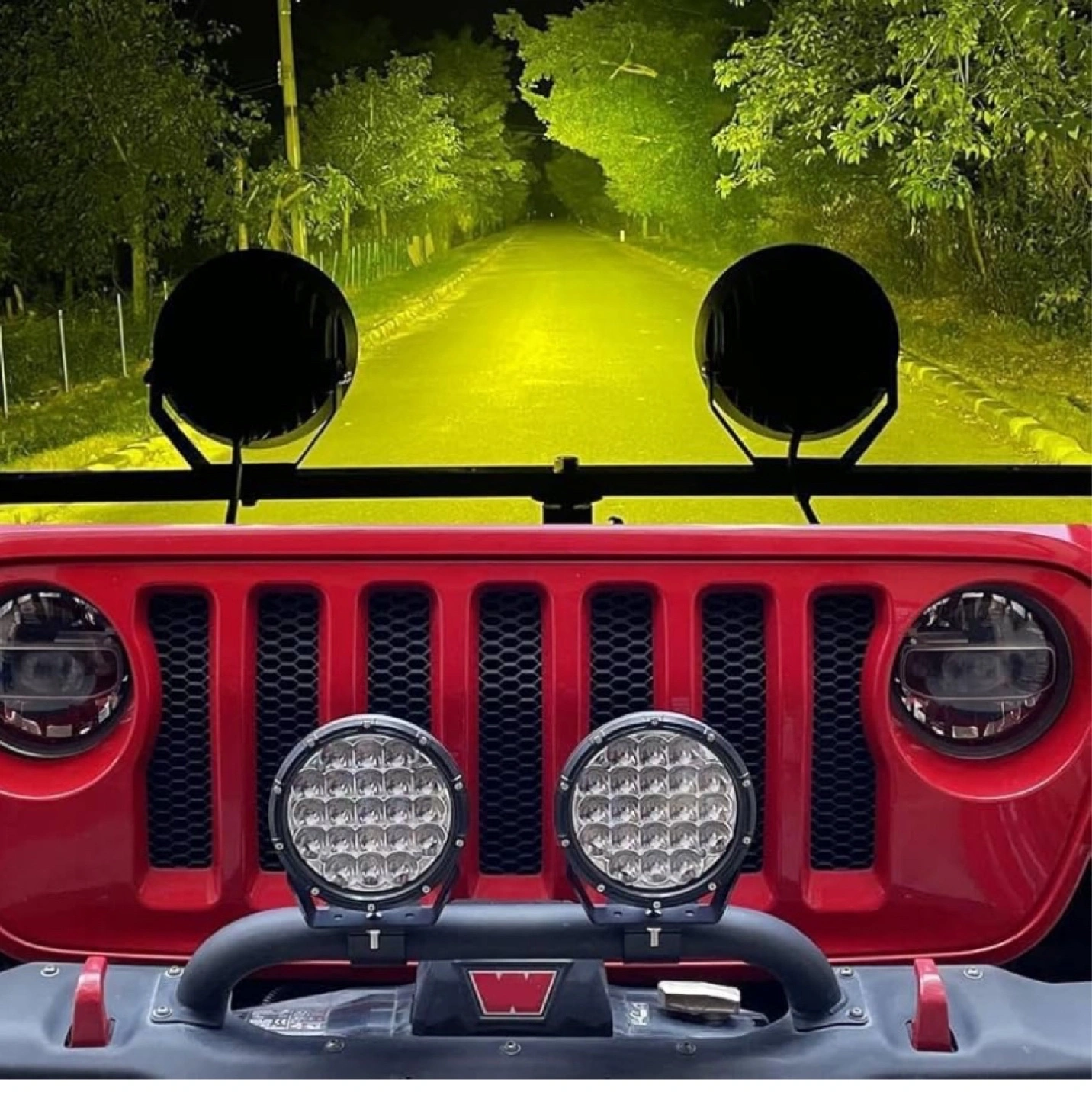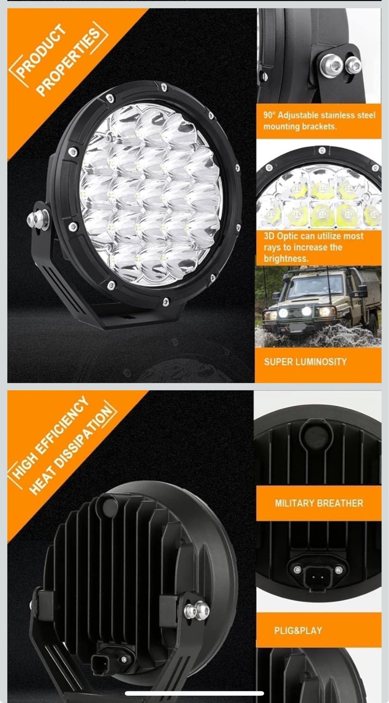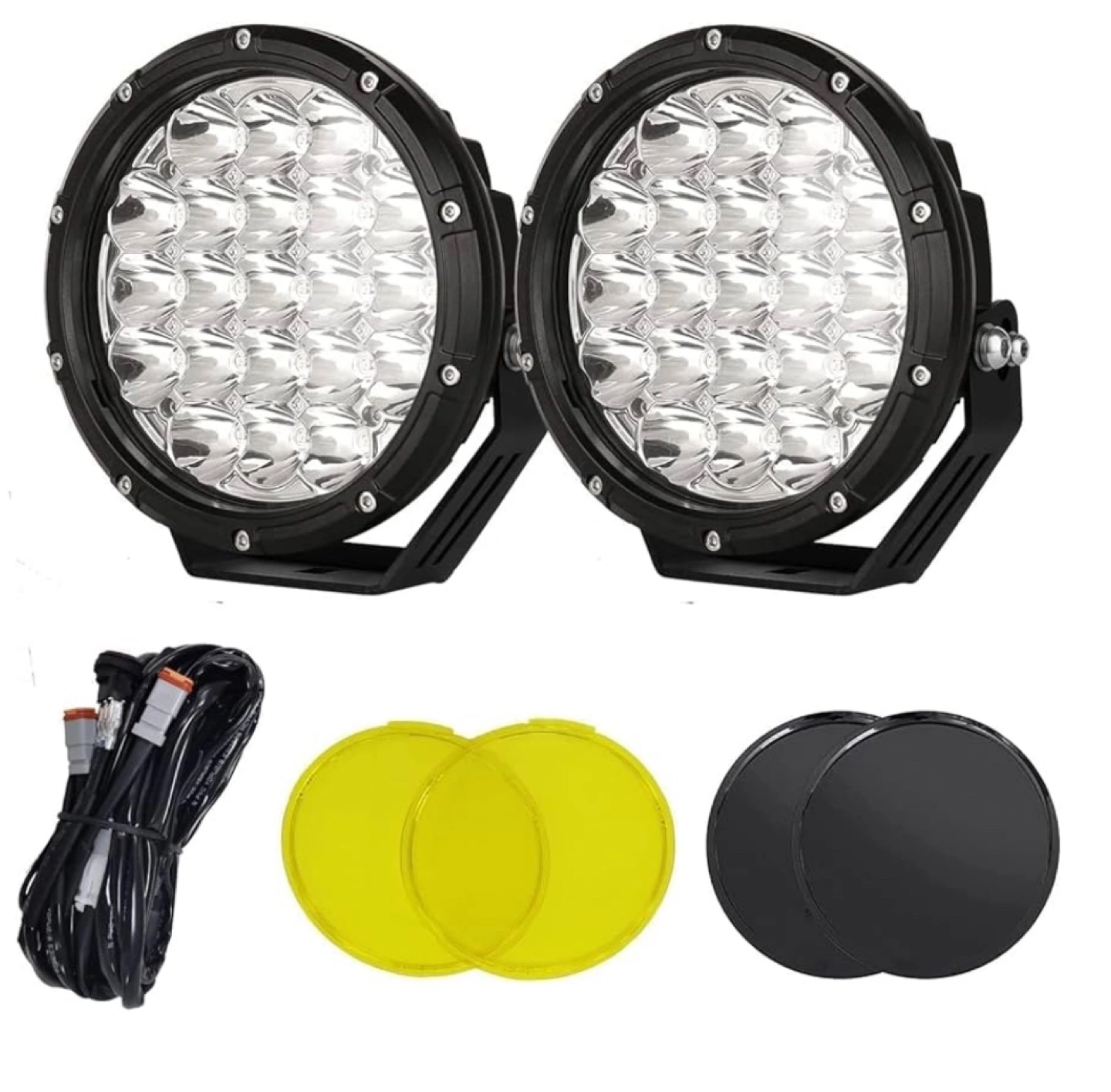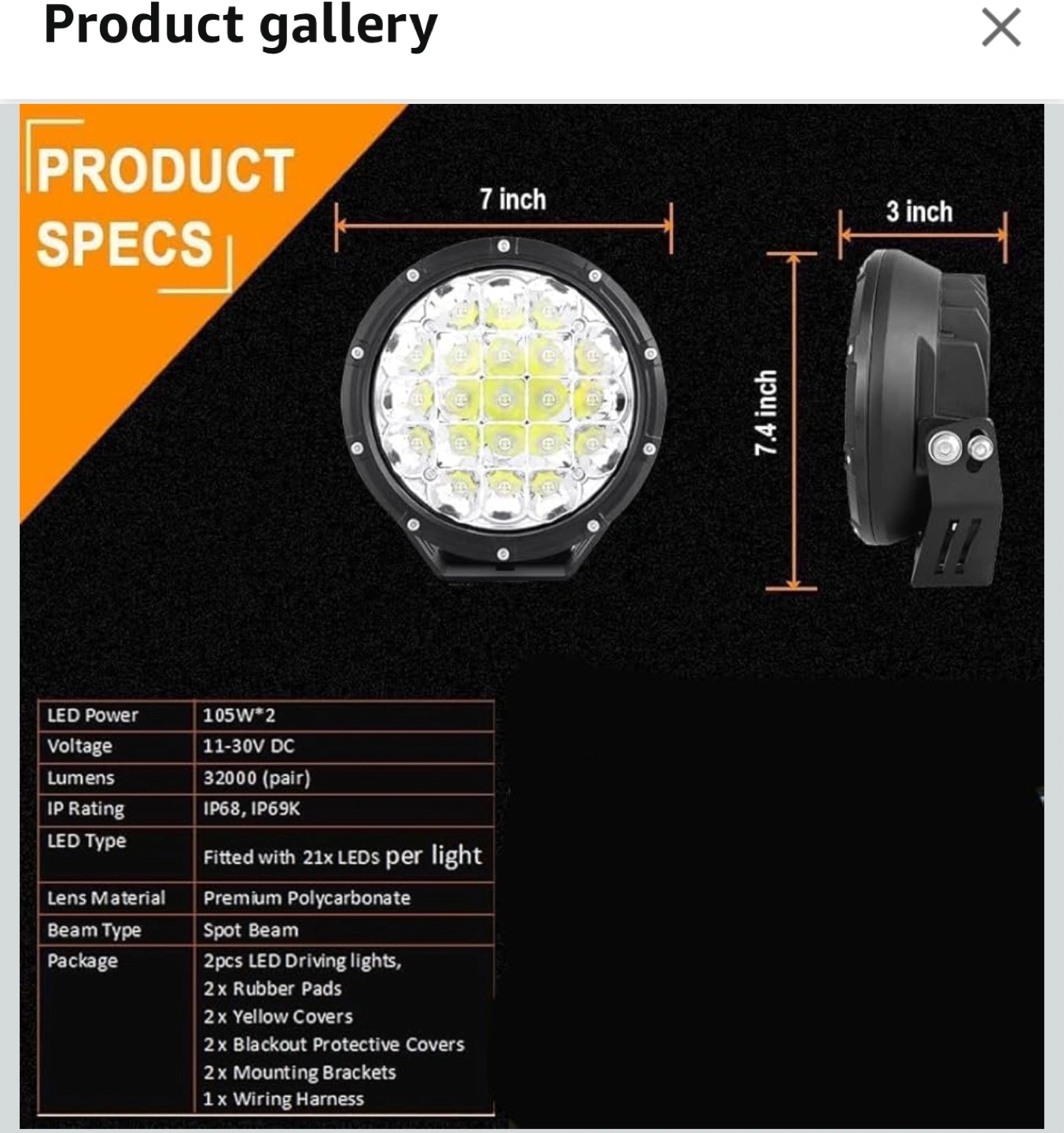 7 inch LED off-road lights. 21x LEDs per light. 32000 lumens. IP68, IP69K rating. Spot beam. Includes wiring harness, yellow and black covers, and mounting brackets. Adjustable stainless steel mounting brackets. Plug and play.