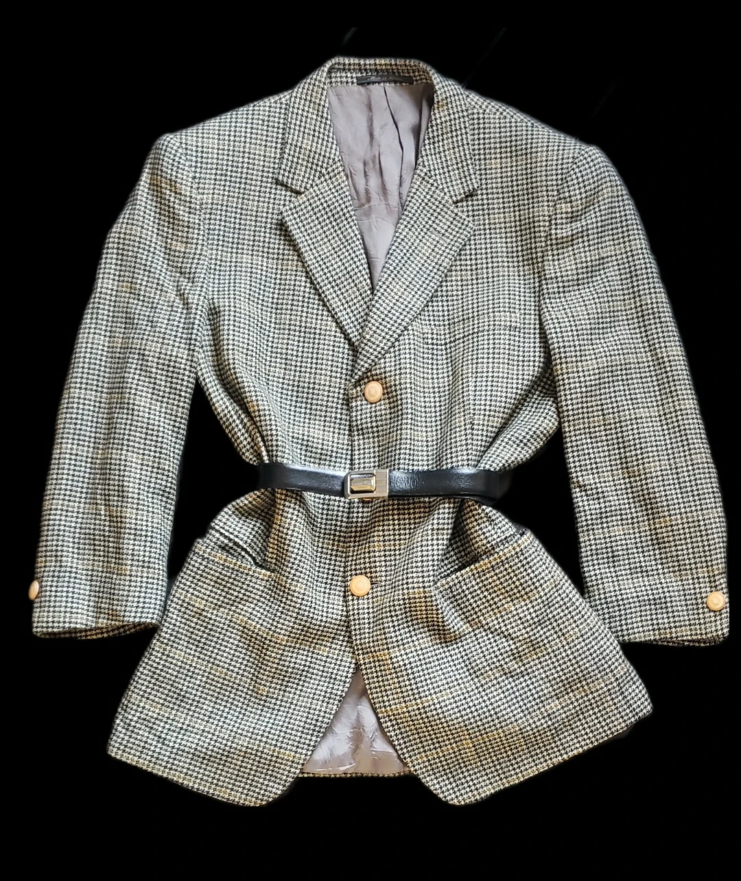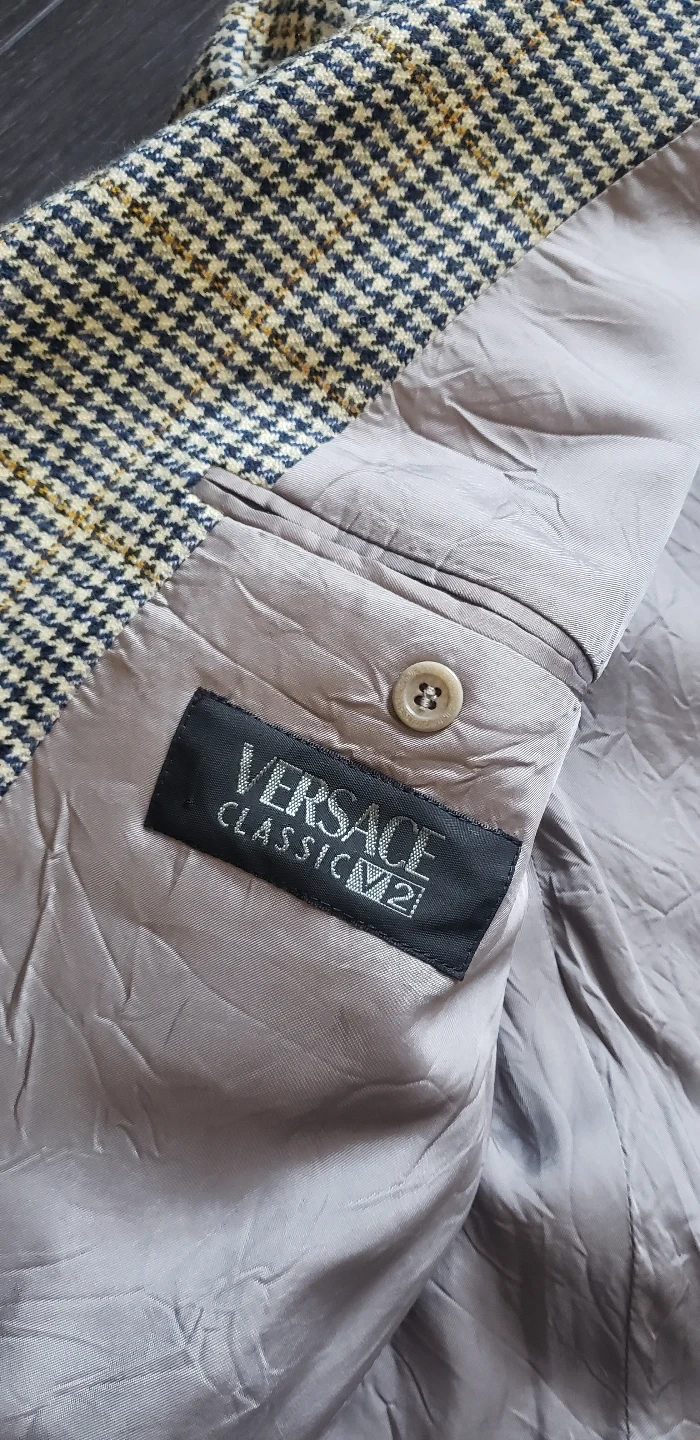 Vintage Versace V2 blazer. Oversize Blazer trend. Houndstooth pattern, satin lined. Three-button closure: brand stamped. Long sleeves w/ built in shoulder pads (option to cut out and resew int. seam). Pocket details.