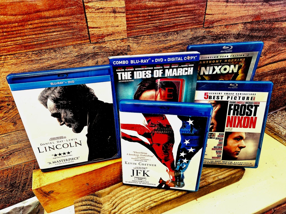 Collection of five Blu-ray movies. Includes political dramas and historical films. Titles: Lincoln, Nixon, JFK, Frost/Nixon and The Ides of March.