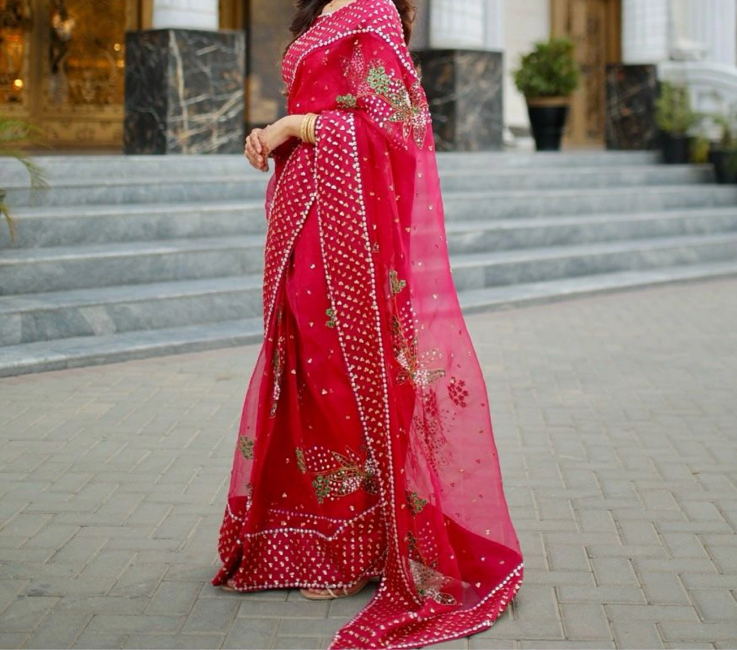 Beautiful red saree, embroidered detailing. Sheer fabric. Perfect for special occasions. Stunning embellishments.