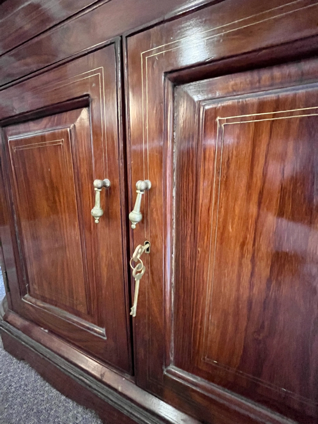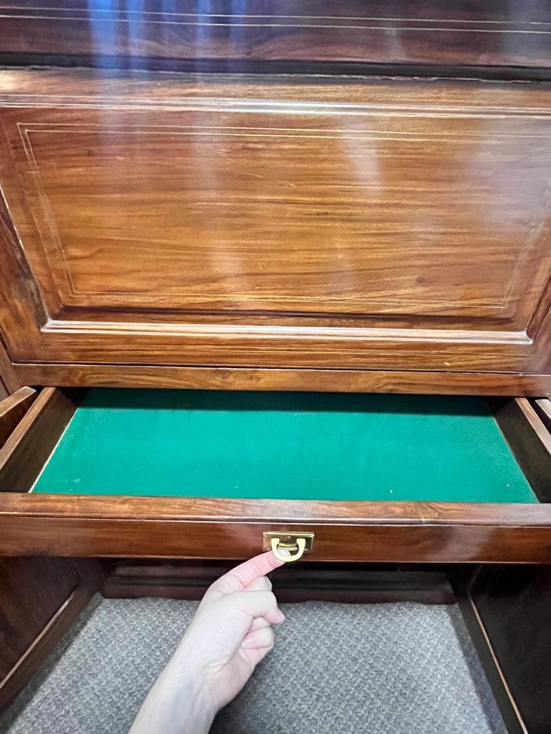 Antique, spacious and quite hefty. Rosewood and brass inlay + knobs. Has some surface scratches and cracks but otherwise sturdy.