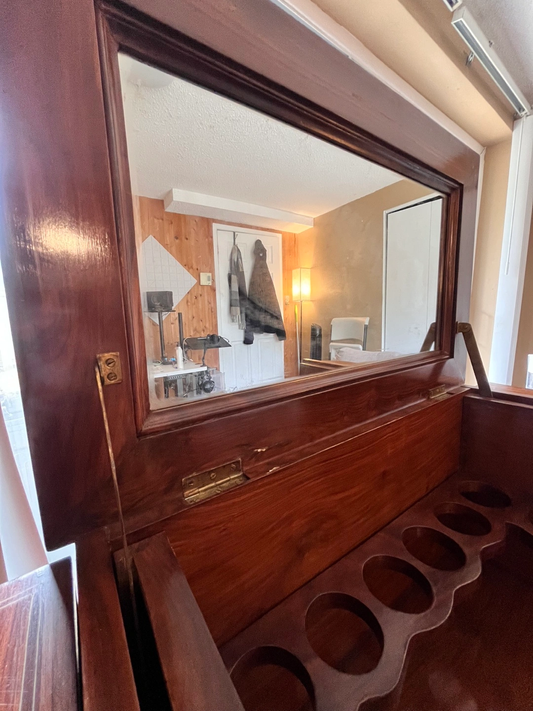 Top lid opens up to reveal a mirror and holders for glasses or bottles. Both sides and bottom drawer also have space for glasses/ bottles.