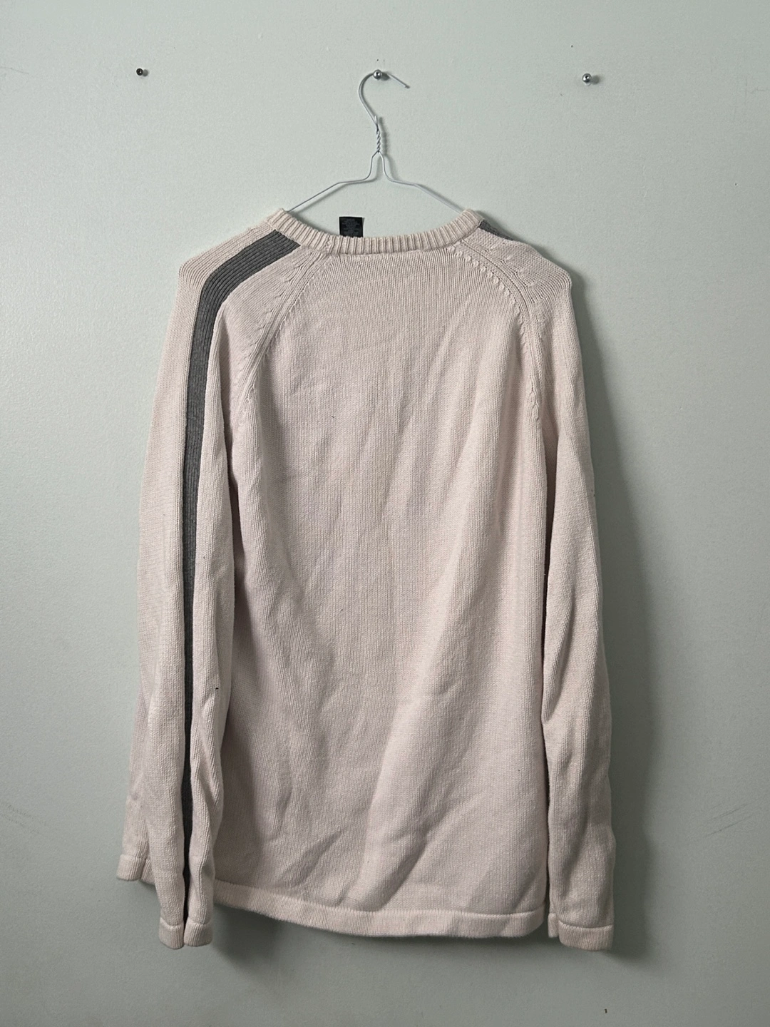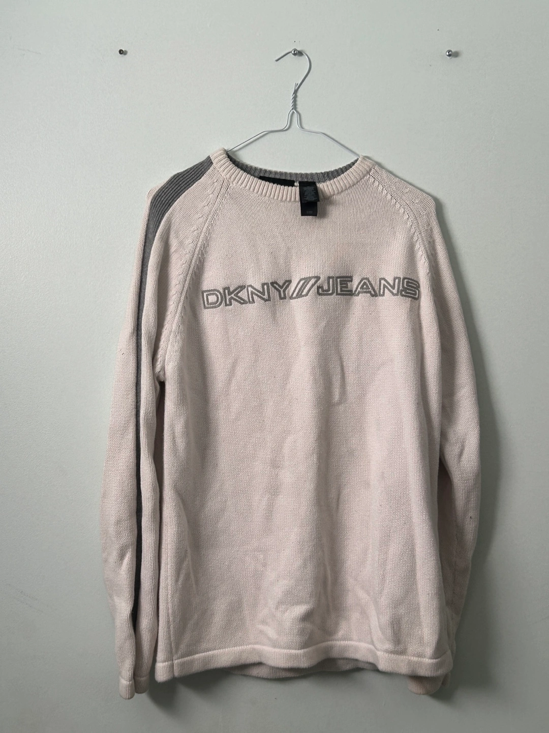white coloured sweater. Features grey detailing on the shoulders and DKNY Jeans branding. Long sleeves, crew neck. Size Medium.