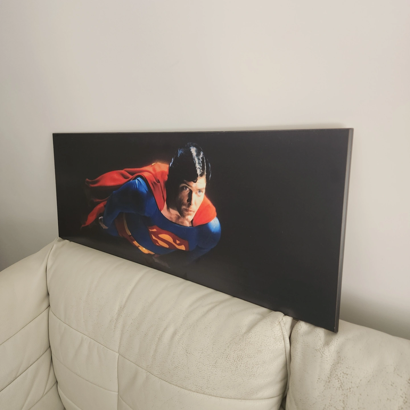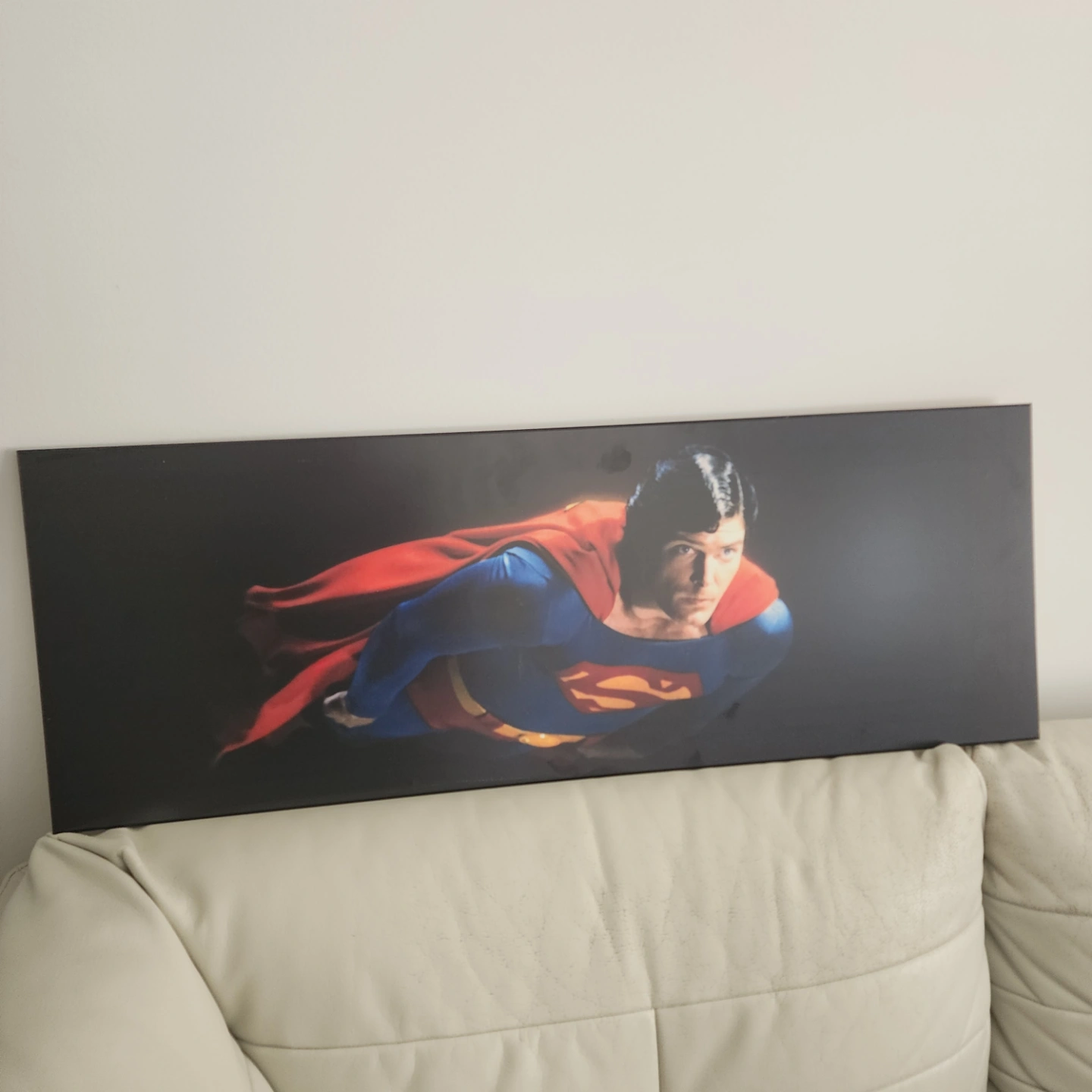 Large horizontal canvas print. Features Superman in flight. Great for a man cave or superhero themed room. Looks great on a wall.