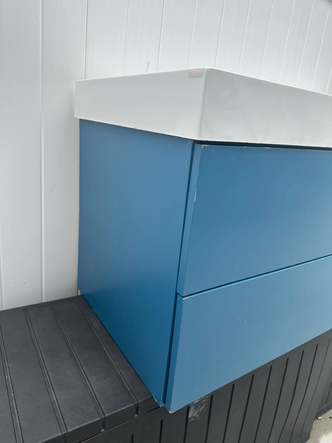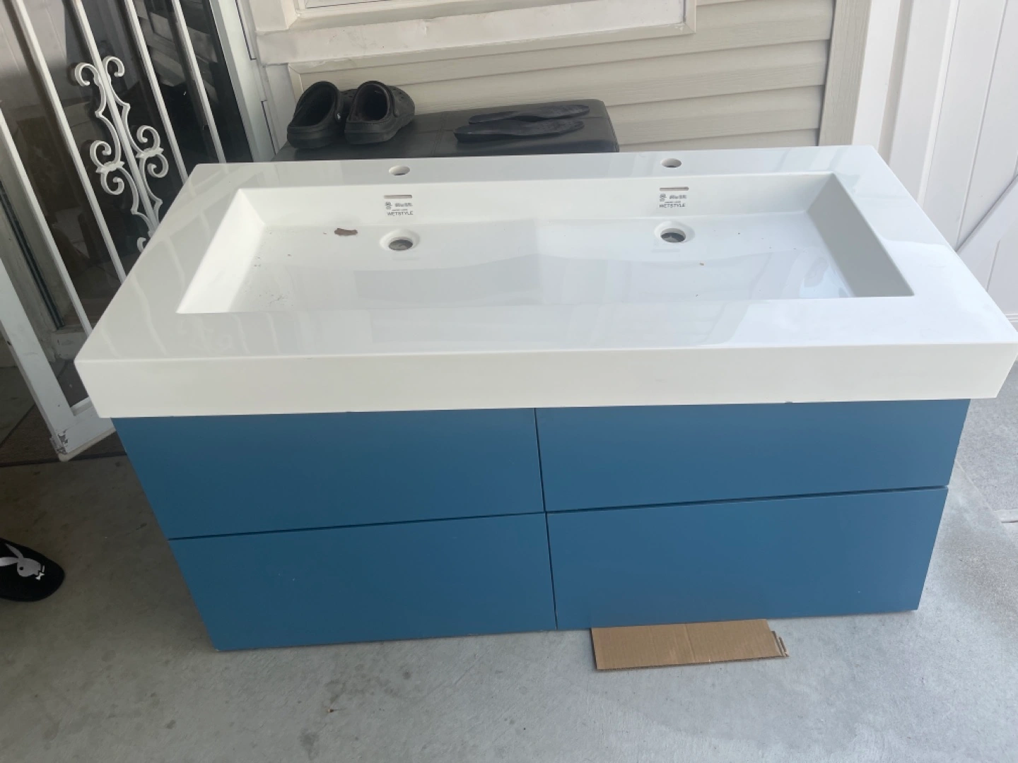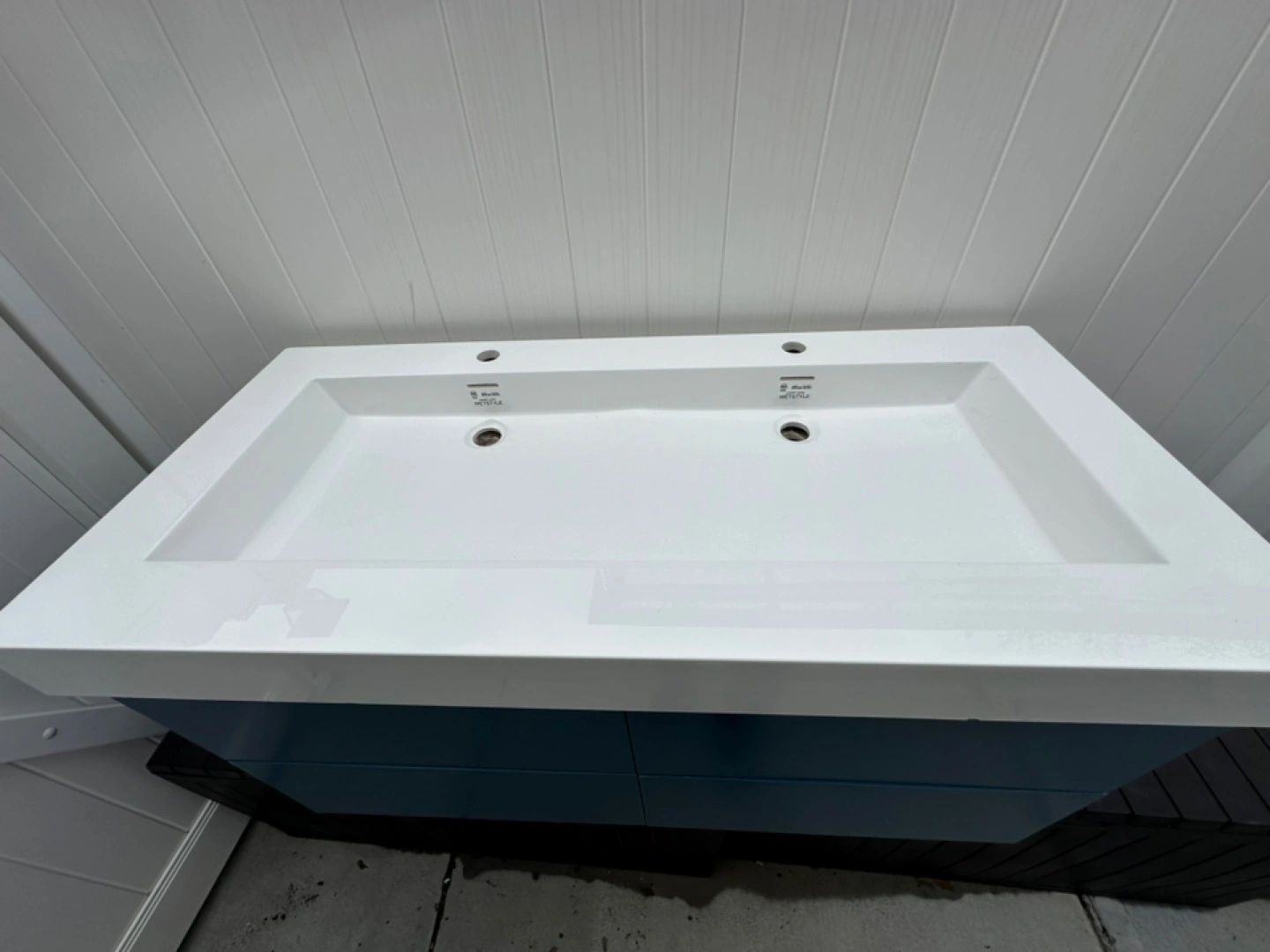 80Double sink bathroom vanity. Blue cabinet with white countertop. Two drawers. Pre-drilled for faucets. Some minor cosmetic imperfections.