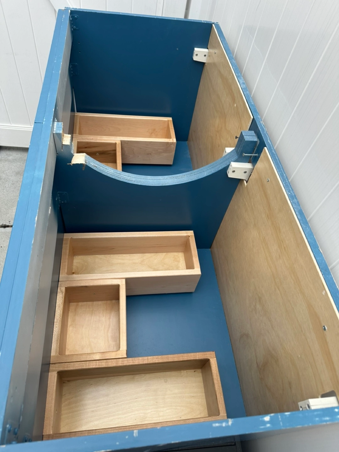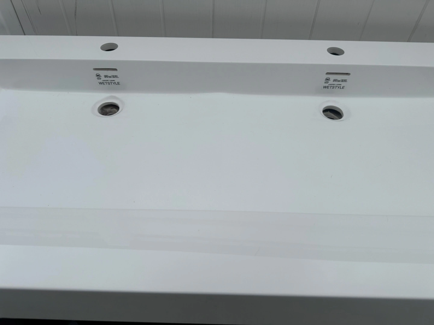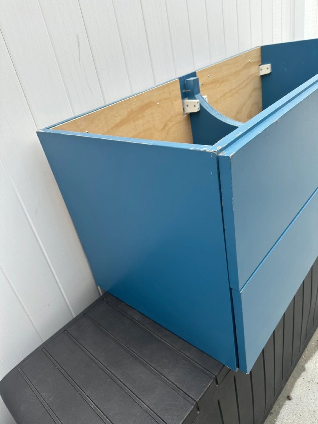 80Double sink bathroom vanity. Blue cabinet with white countertop. Two drawers. Pre-drilled for faucets. Some minor cosmetic imperfections.