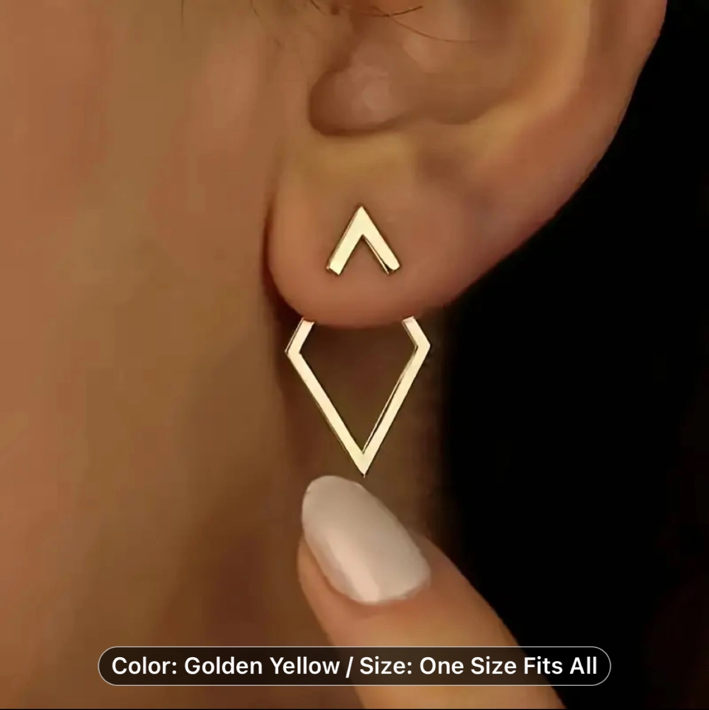 Unique gold earring set. Features a pair of diamond-shaped earrings and a single, small triangle earring. One size fits all. Golden yellow colour.