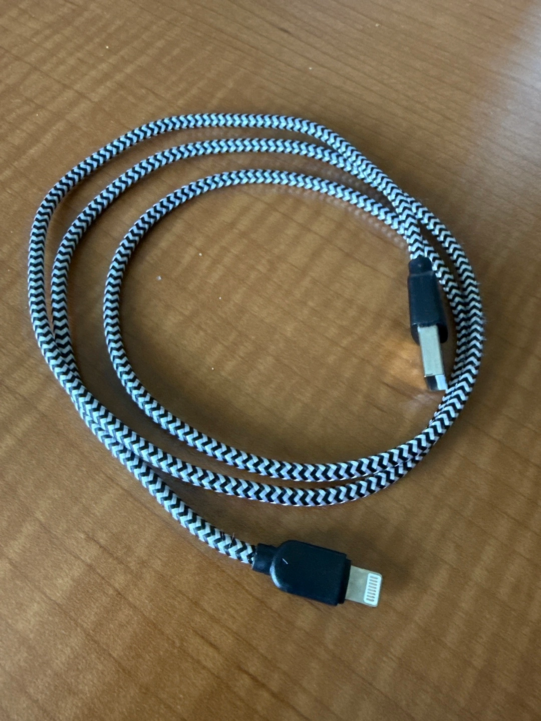 Durable braided USB to Lightning cable. Grey and black design. Lightning connector on one end and USB-A connector on the other.
