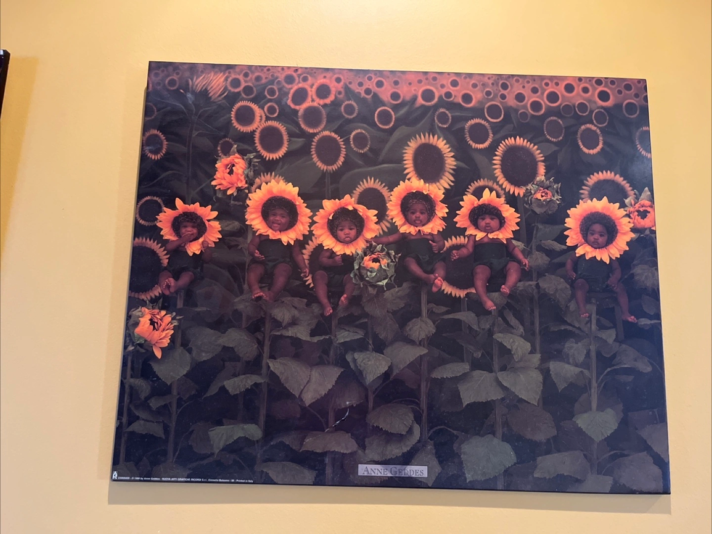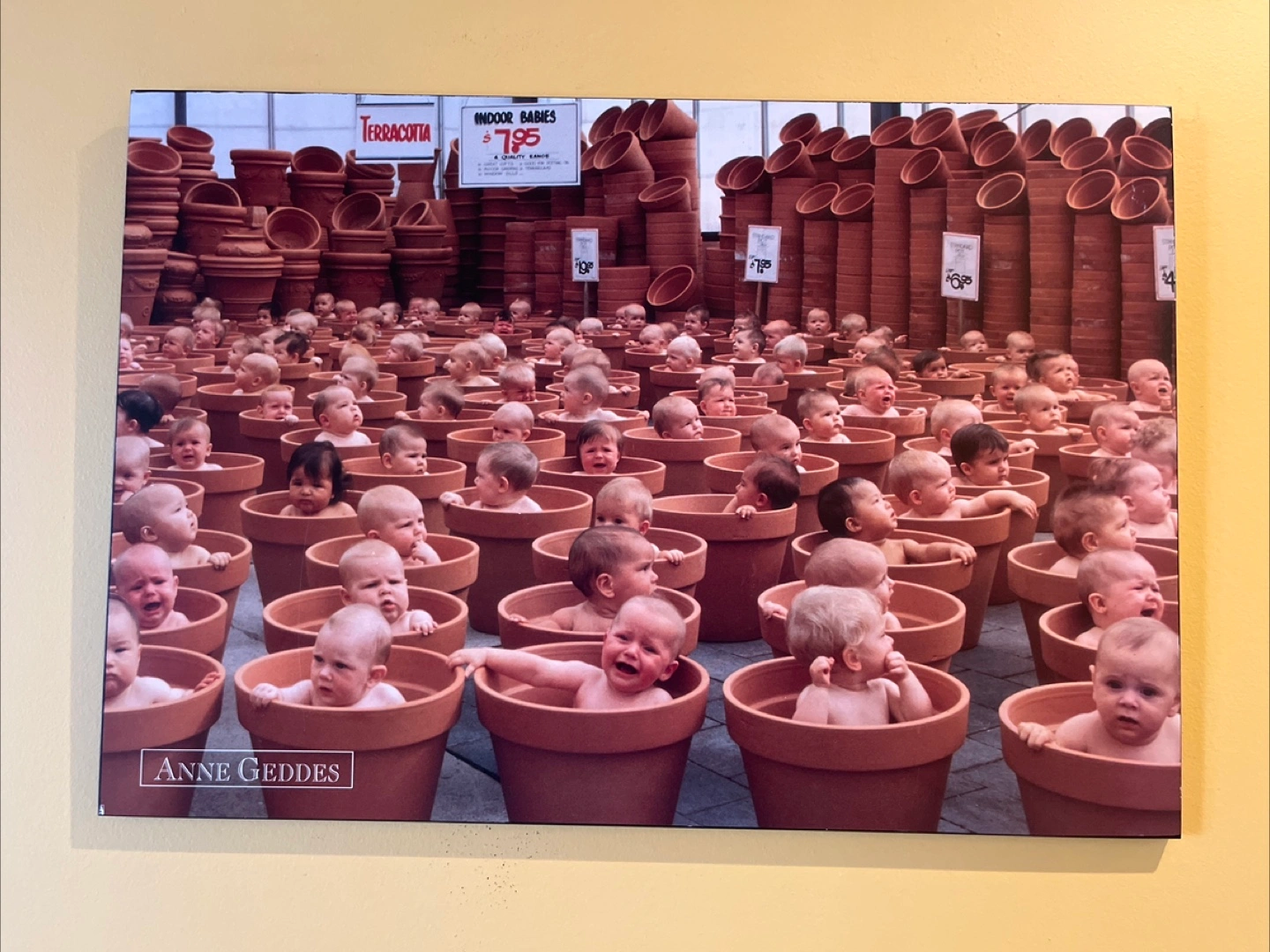 Four framed prints featuring iconic Anne Geddes baby photography. Various scenes depicted, including babies in terracotta pots and flowers. Excellent condition. Perfect for a nursery or child's room. $10 each