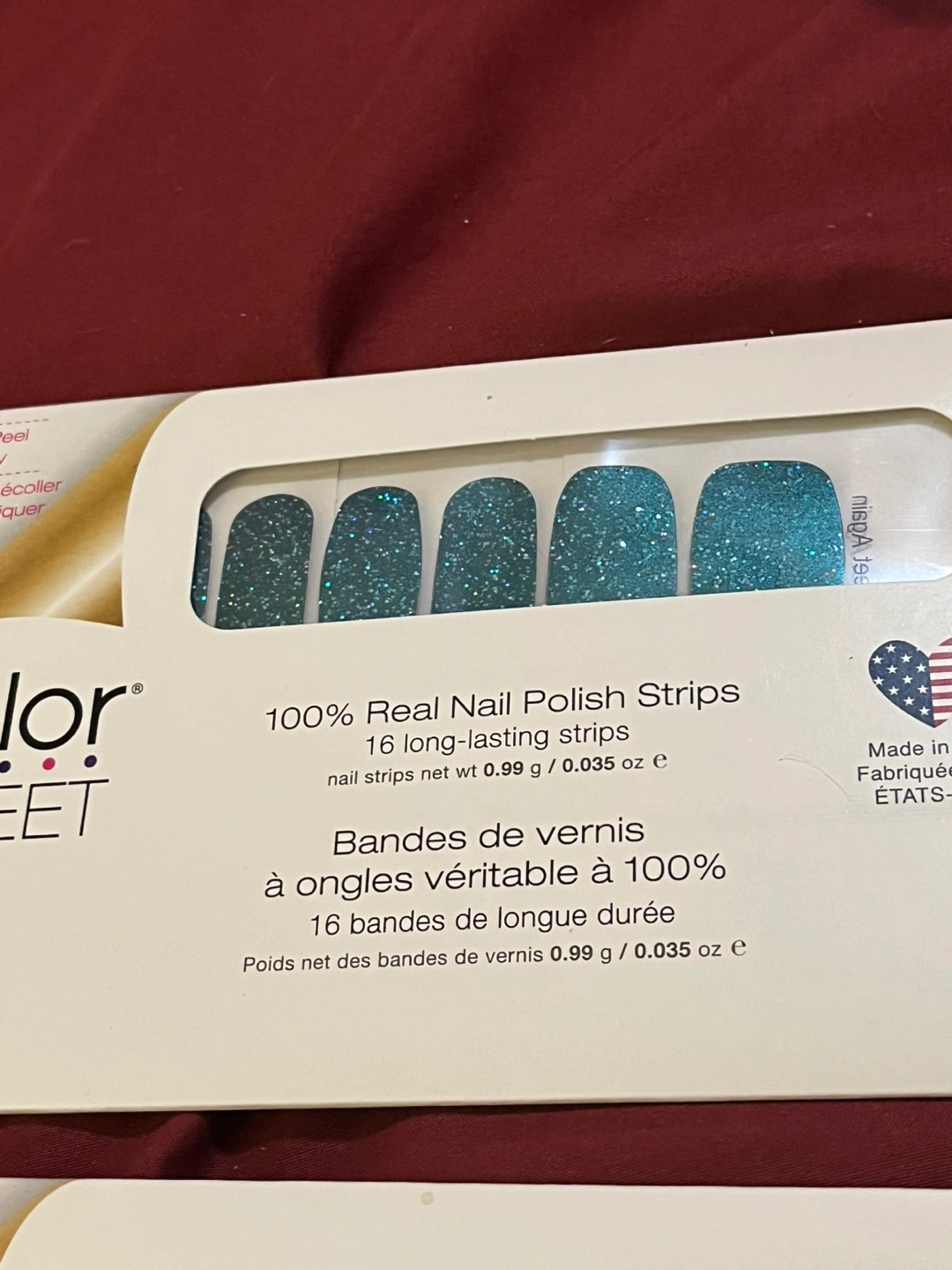Three sets of Color Street 100% real nail polish strips. Each set includes 16 long-lasting strips. Shades include teal and a rose gold. Easy peel and apply.