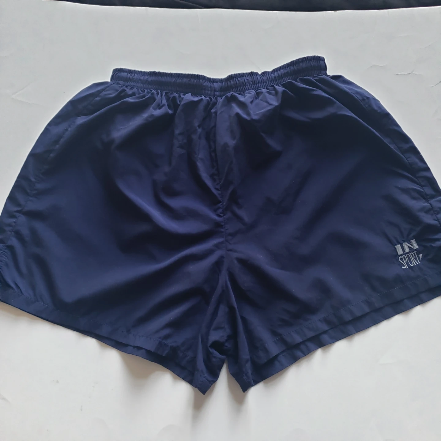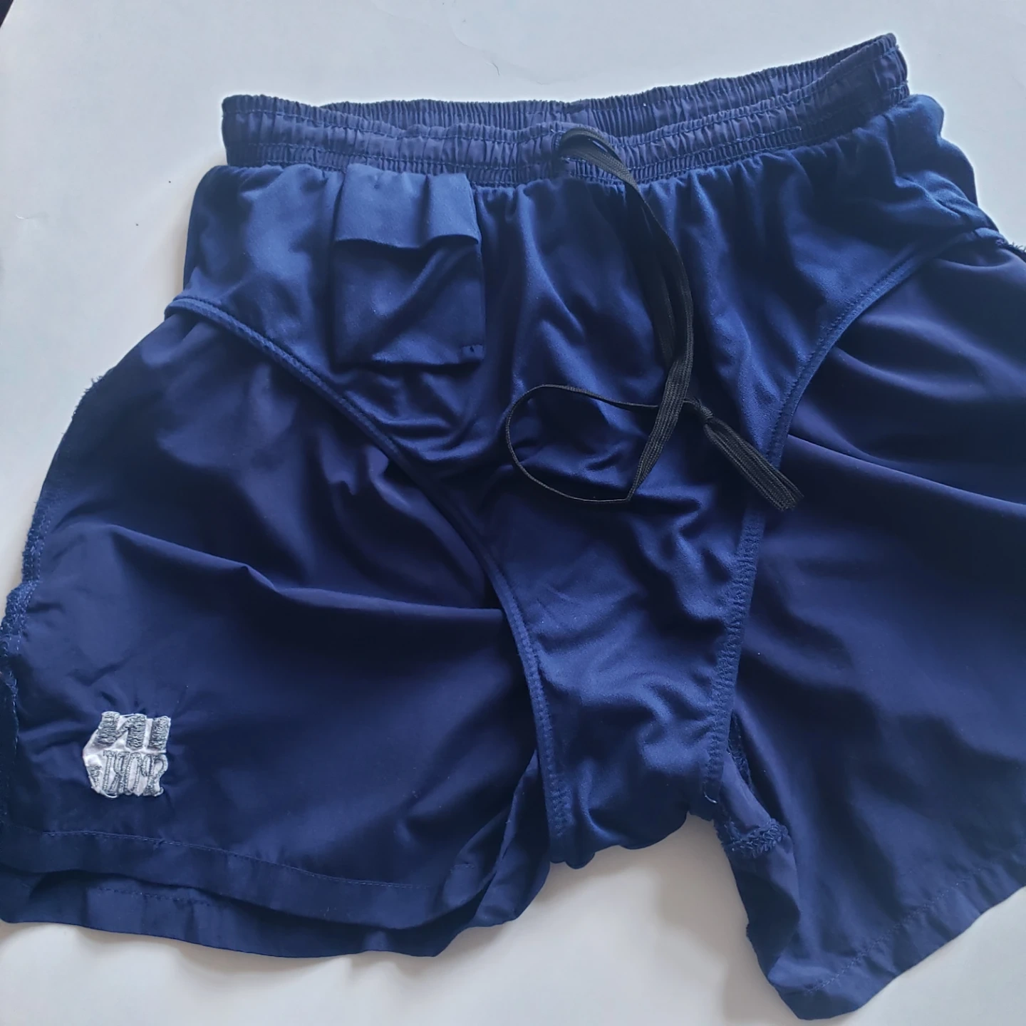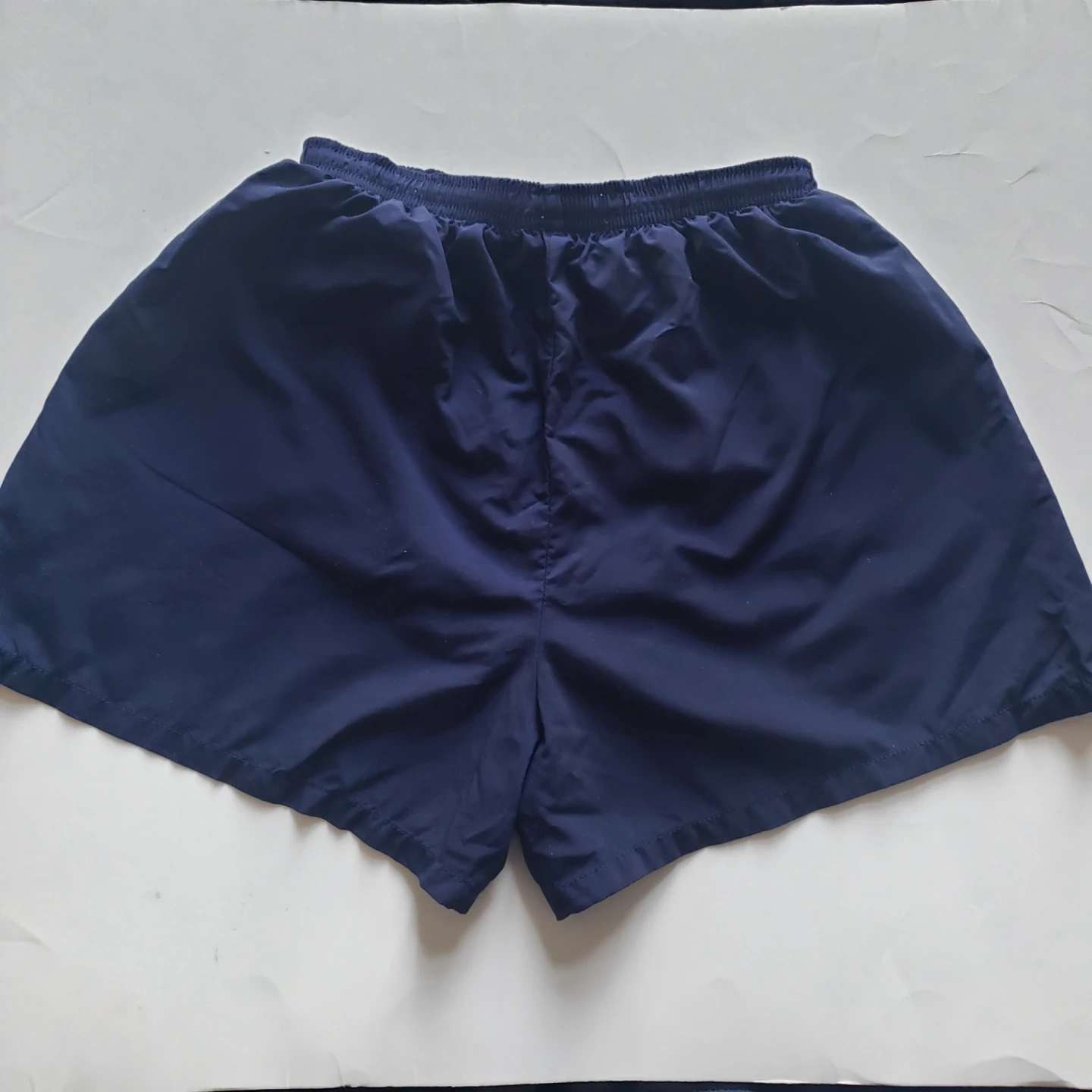 Women's navy blue running shorts. Elastic waistband. Small pocket on the inside.