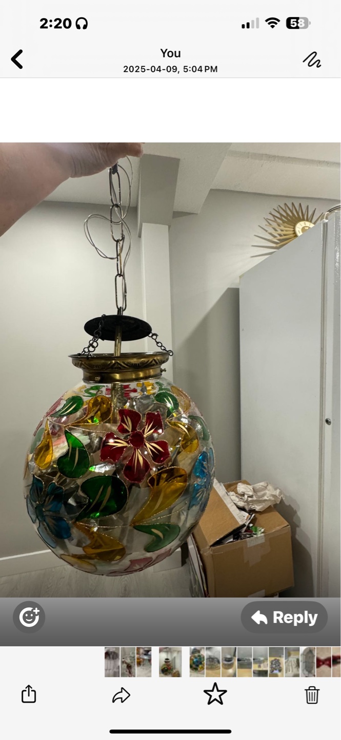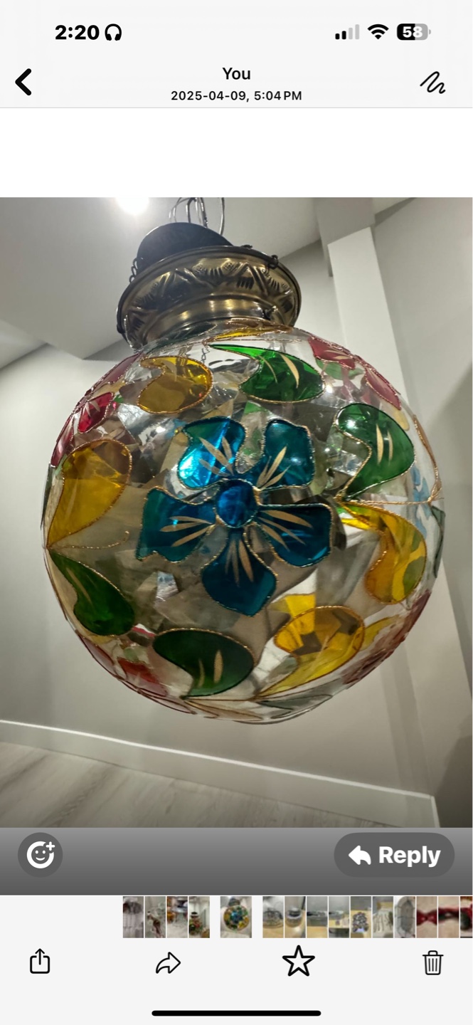 Beautiful globe pendant light. Hand-painted floral design. Brass accents. Chain included. Perfect for adding character to any room.