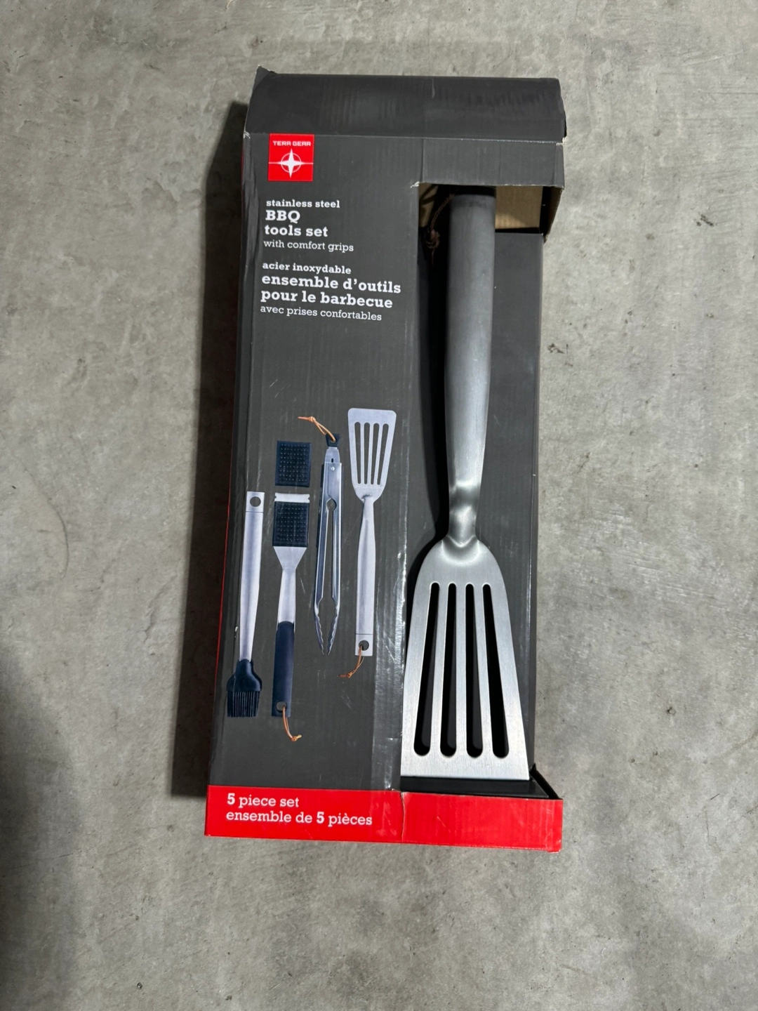 Buy & SellTerra Gear 5-Piece BBQ Tool SetTerra Gear 5-Piece BBQ Tool Set$15Stainless steel BBQ tools. Includes spatula, tongs, brush, and grill cleaner. Comfortable grips. New in box.WHERE TO MEETCheck LocationView MapSELLERFarzanaRanchlands442 reviews0 chats·0 favorites·16 viewsSEND CHAT TO SELLERHi Farzana! I’m interested in your listing.Hi Farzana! I’m interested in your listing.Get the Karrot app to chatSign In to chat