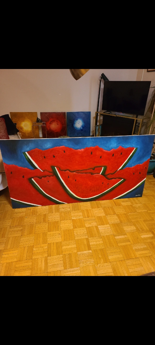 Hand-painted canvas. Vibrant colours. Depicts multiple watermelon slices. Blue background. Signed by artist.