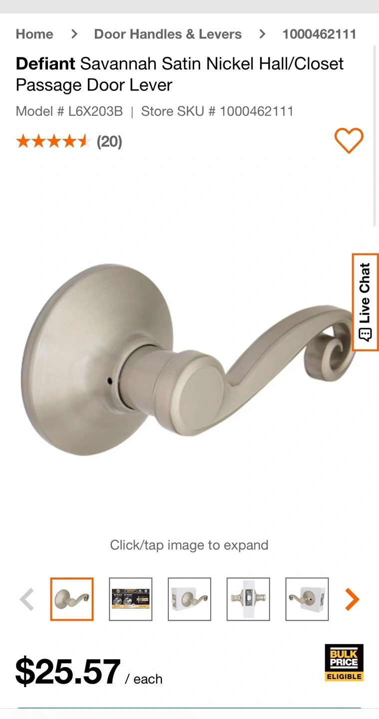 6 used Defiant Freedom satin nickel (silver) door lever handles. Perfect for renovations or replacements. Hall/closet passage levers.