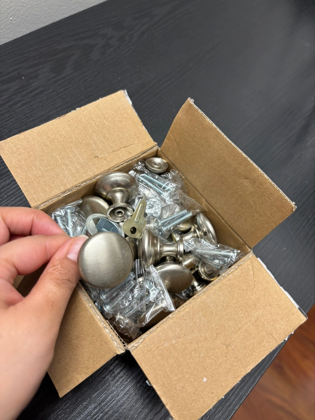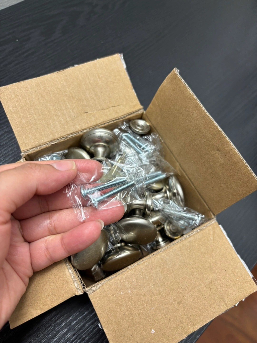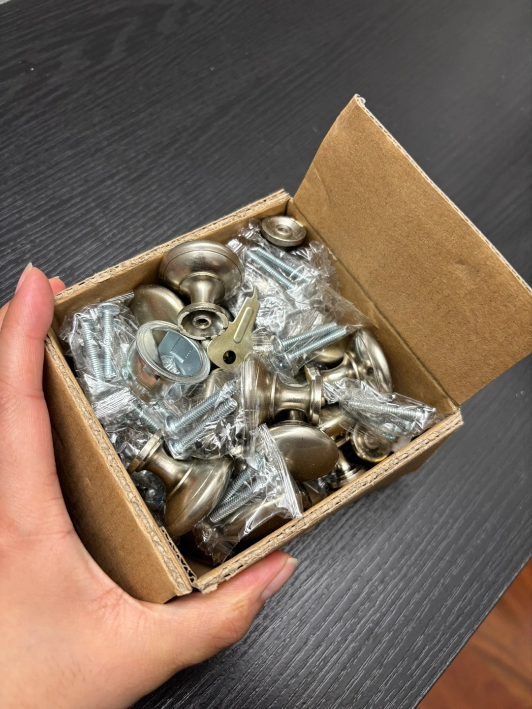 Used cabinet knobs. Brushed nickel finish(silver). Includes unused screws. Sold as a package.