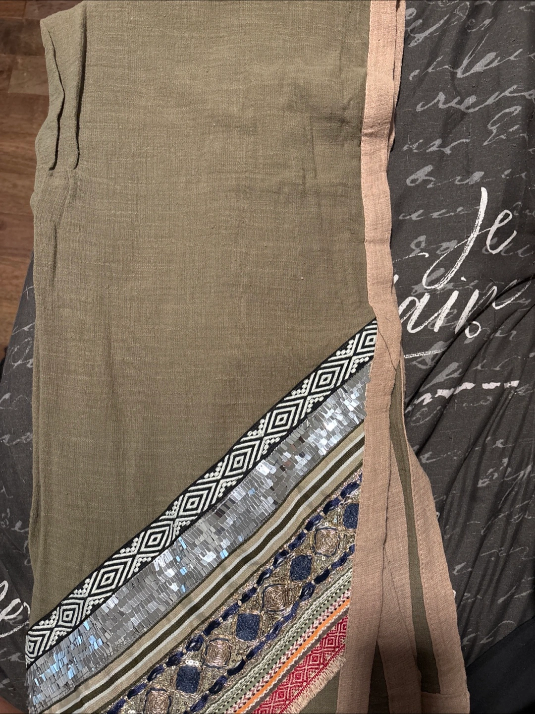 Olive green tunic scarf.Features unique embellishments along the side. Lightweight material. Casual style. Size not specified.