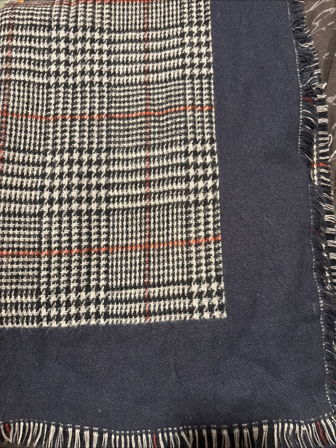 Soft, cozy scarf. Features a black and white houndstooth pattern with orange accents. Fringed edges. Perfect for fall and winter.