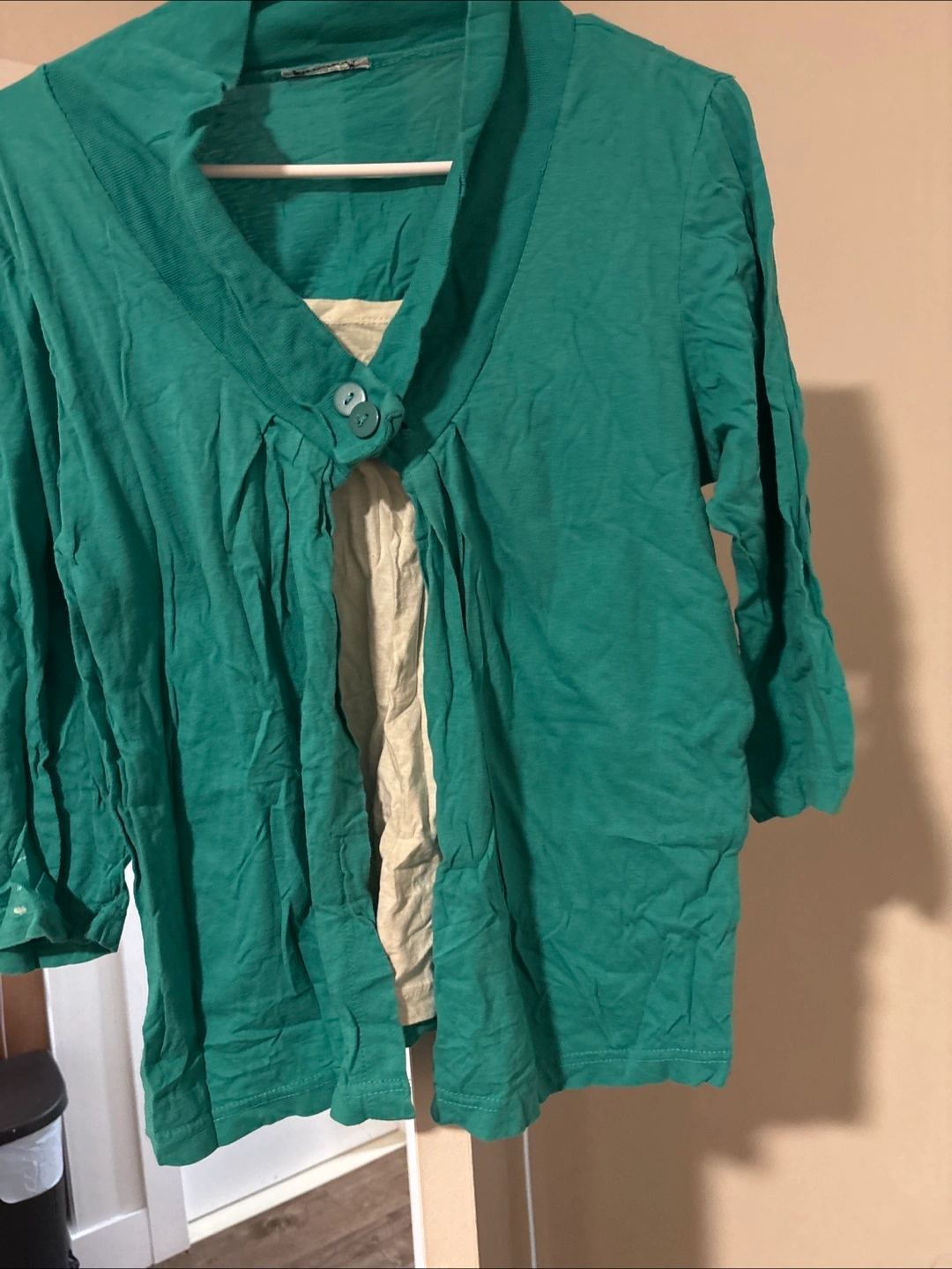 Women's teal knit cardigan. Three quarter sleeves. Open front with button closure. Lined with beige fabric. Casual style.
