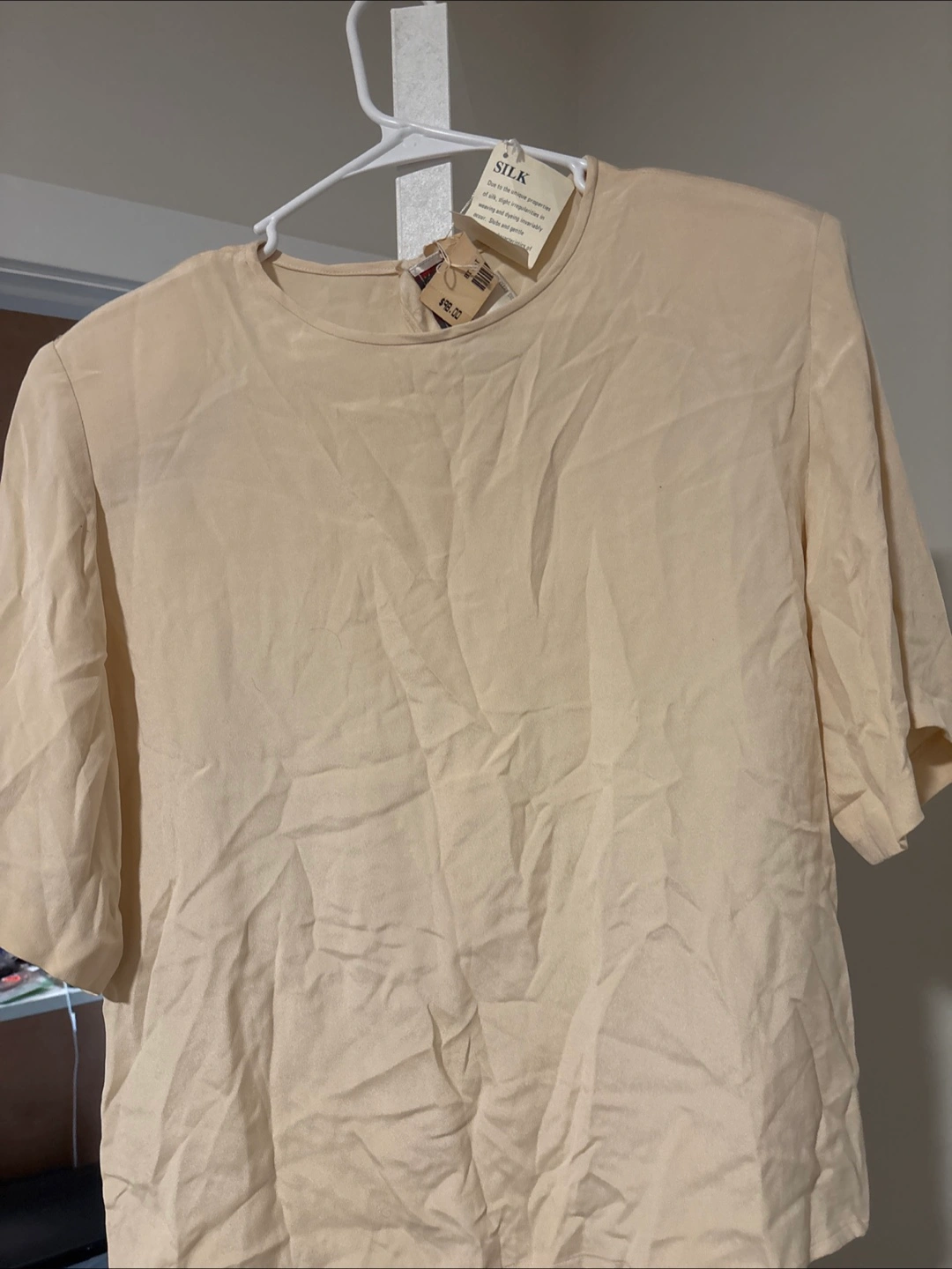 Short sleeve, cream-colored silk blouse. Round neck. Slight irregularities in weaving and dyeing may occur.