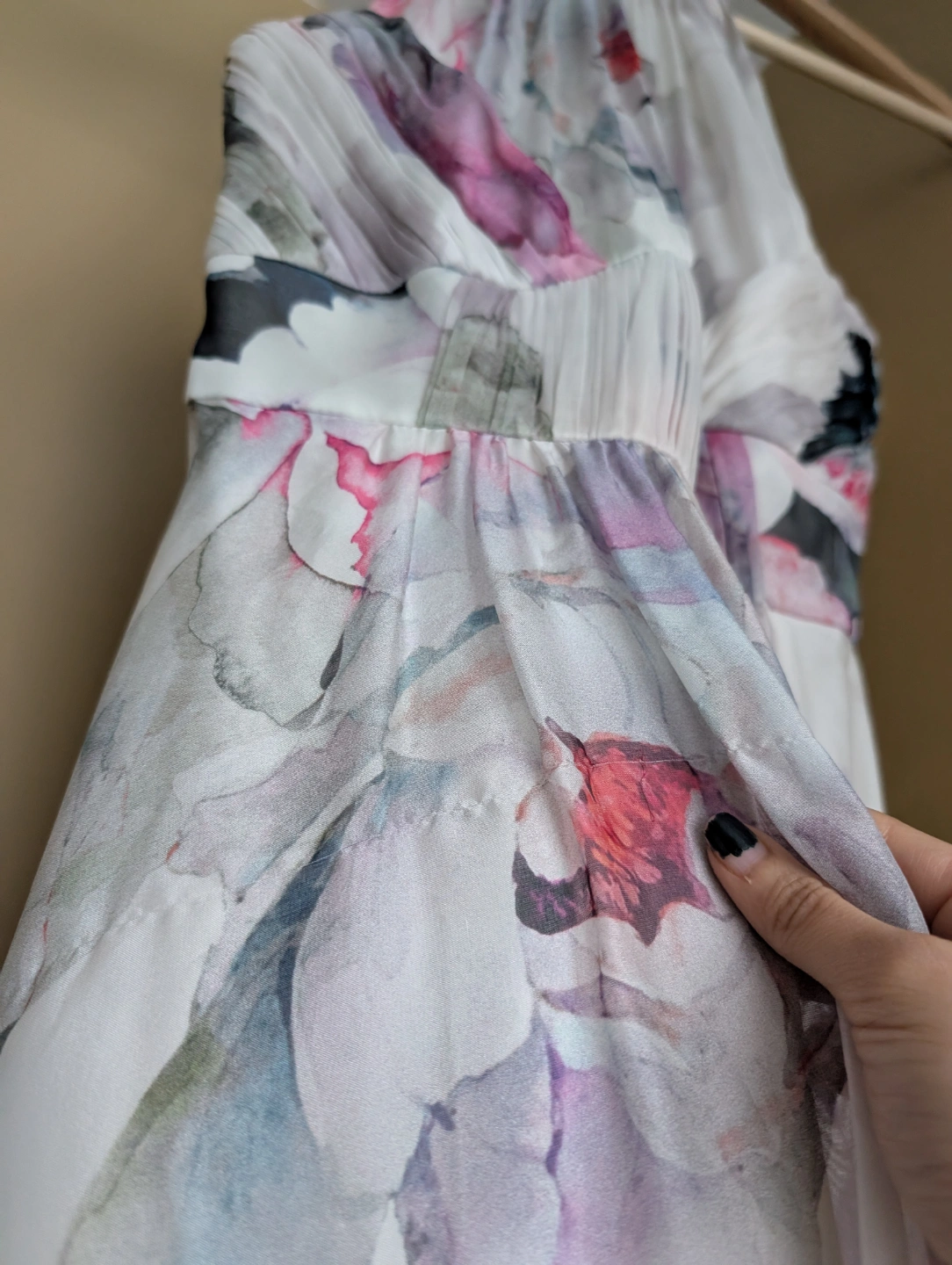 Beautiful dress worn just once. There's a run on the front of the skirt part of the dress (see video & second last image for closeup photo of the run). However, due to the floral design, it's quite subtle and only visible if you're actively looking for it up close