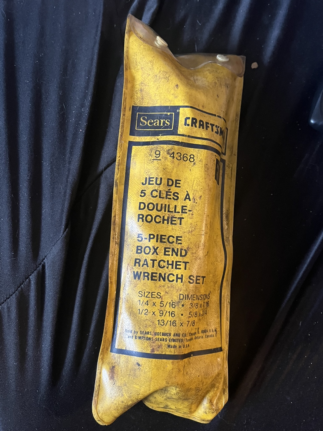 Vintage 5-piece box end ratchet wrench set. Sizes include 1/4 x 5/16, 1/2 x 9/16, 13/16 x 7/8. Dimensions: 3/8 x 7/16, 5/8 x 3/4. Made in the USA. Sold by Sears.