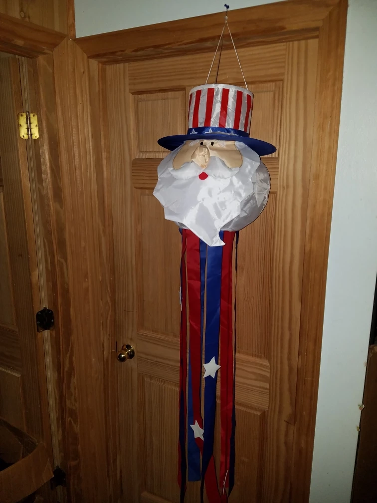Patriotic windsock. Features Uncle Sam's face with a top hat and long streamers. Perfect for the 4th of July or any patriotic celebration.