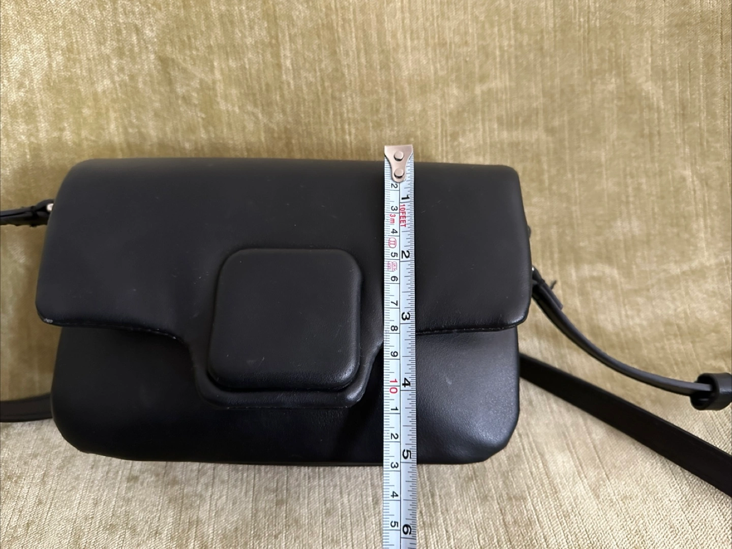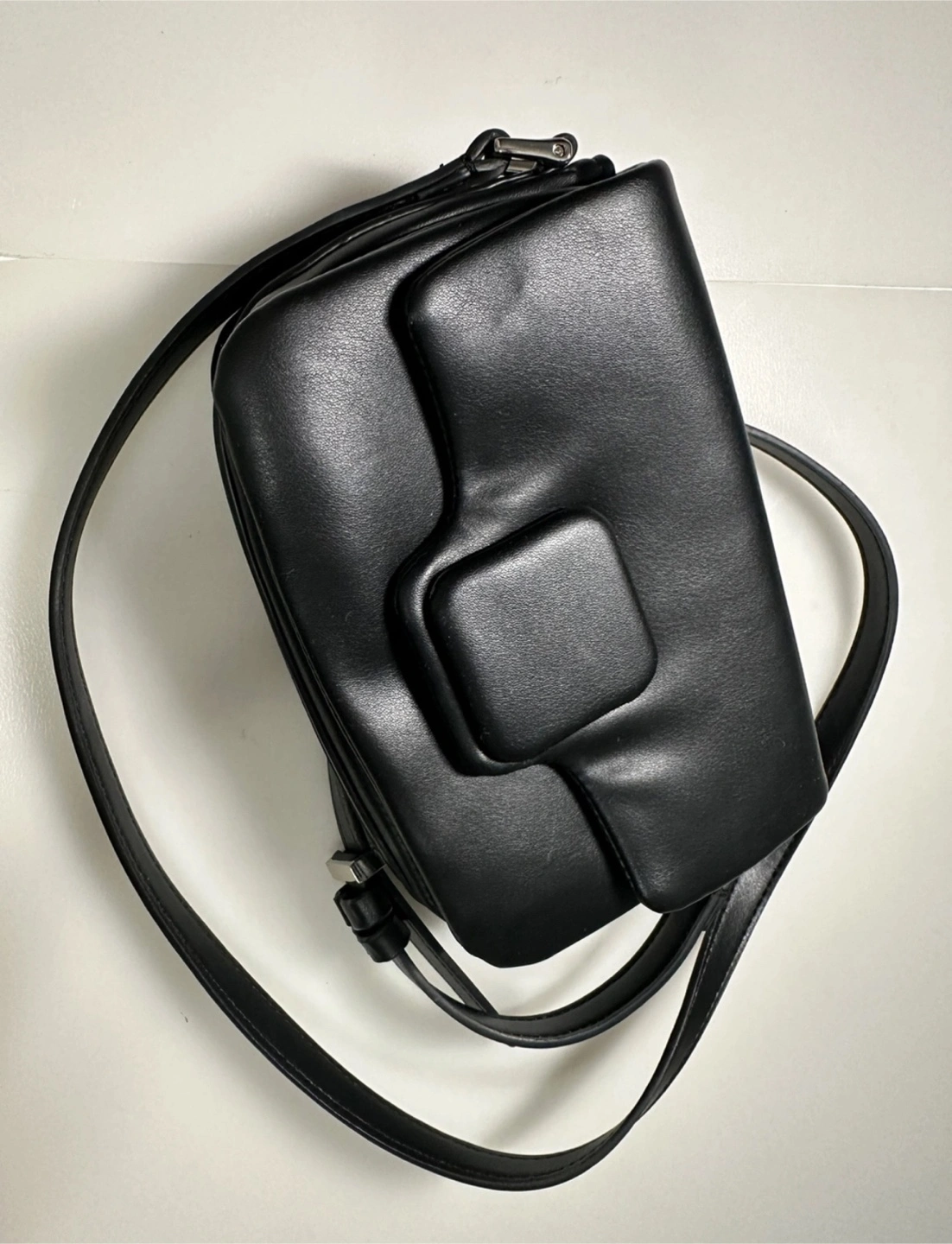 Small black crossbody bag. Features a flap closure and adjustable strap. Interior pocket. Faux leather.