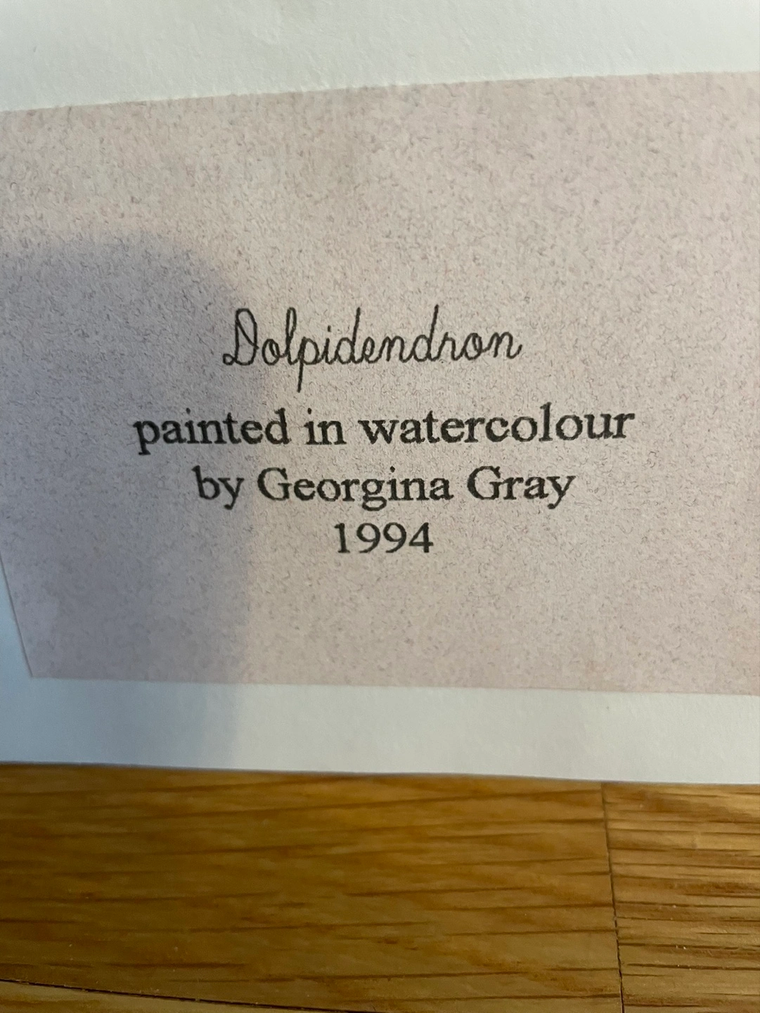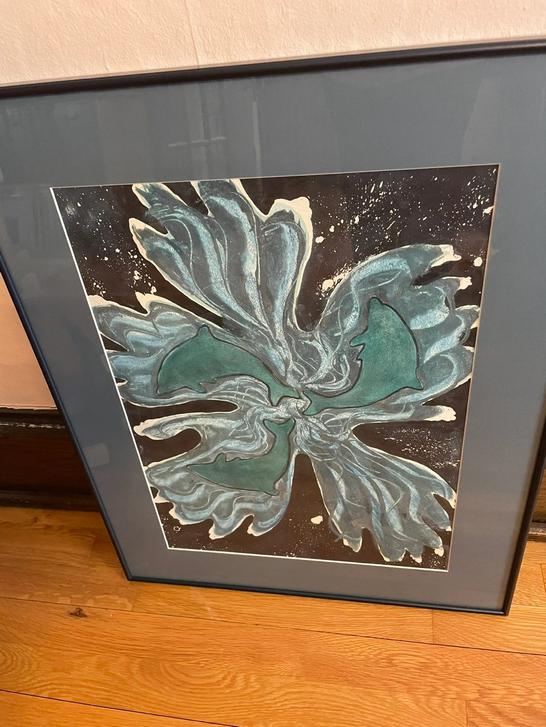 Framed watercolour painting. Titled *Dolpidenron*. Created by Georgina Gray in 1994. Unique artwork, abstract style. Teal and black colours. Ready to hang.