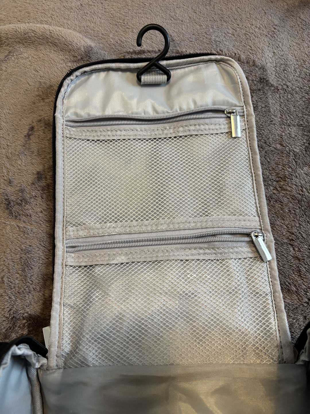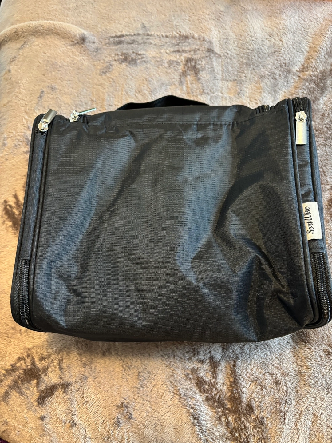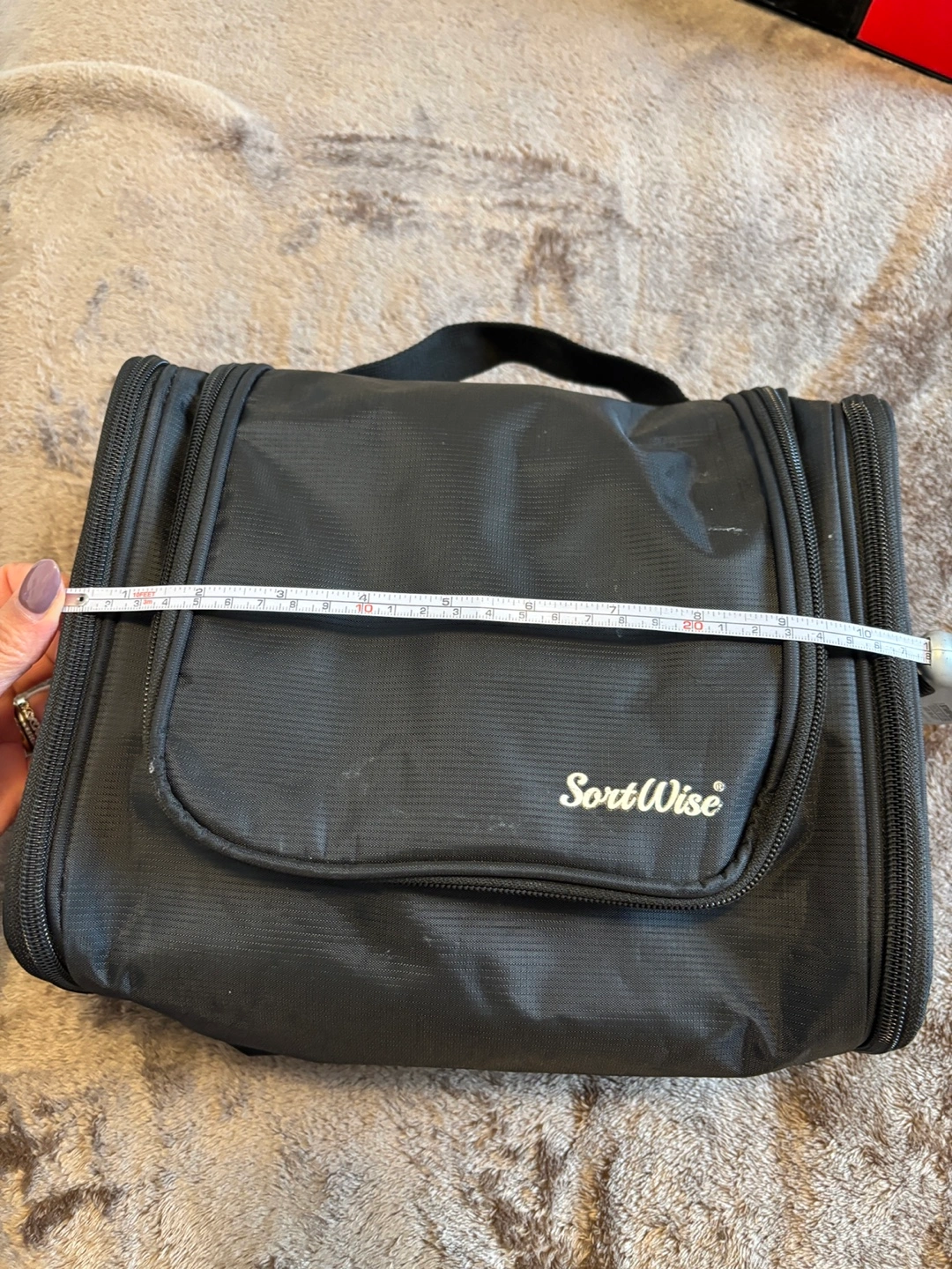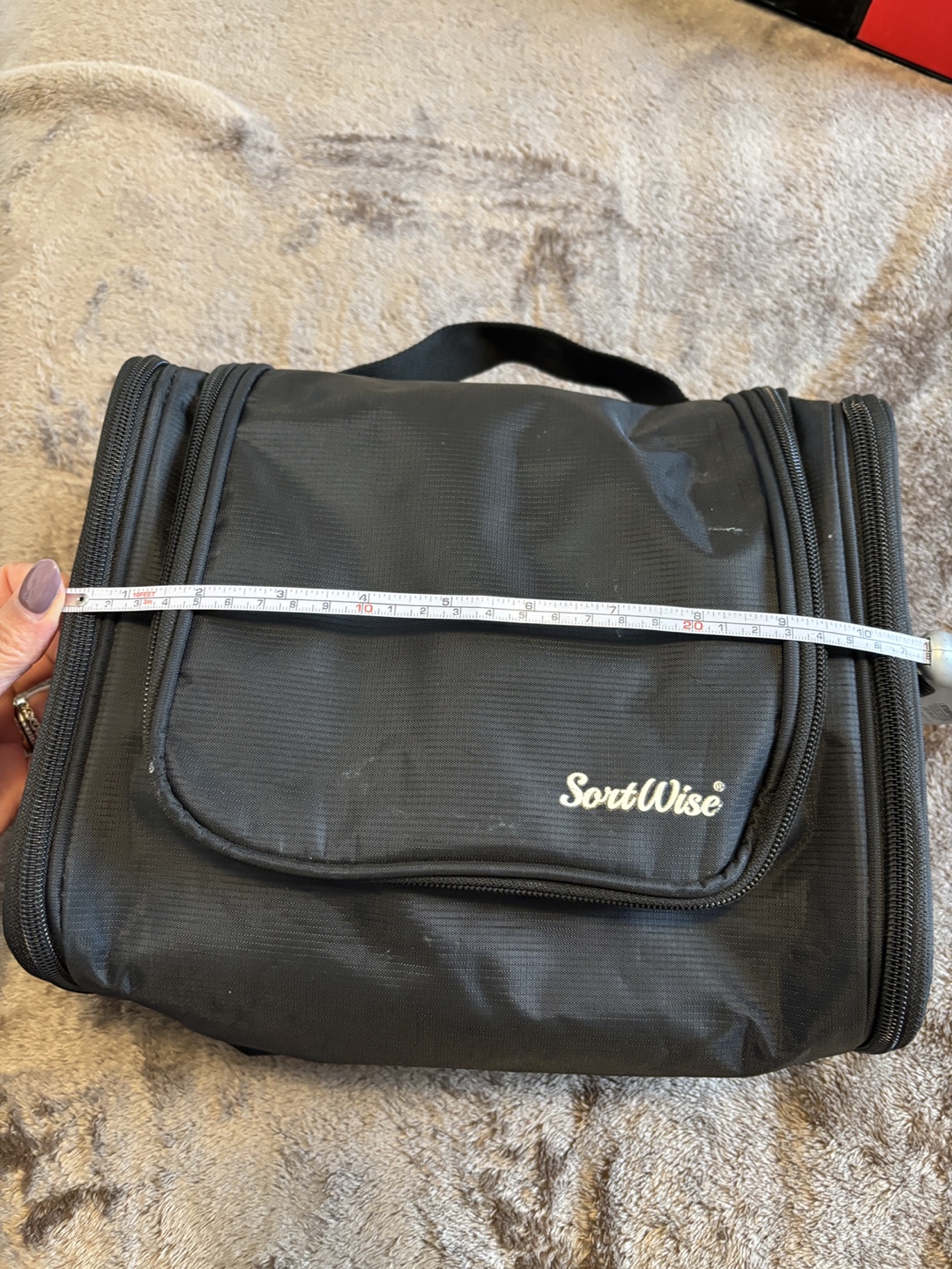 Black travel toiletry bag. Features multiple compartments and a hanging hook. Measures approximately 23cm wide x 15cm tall.
