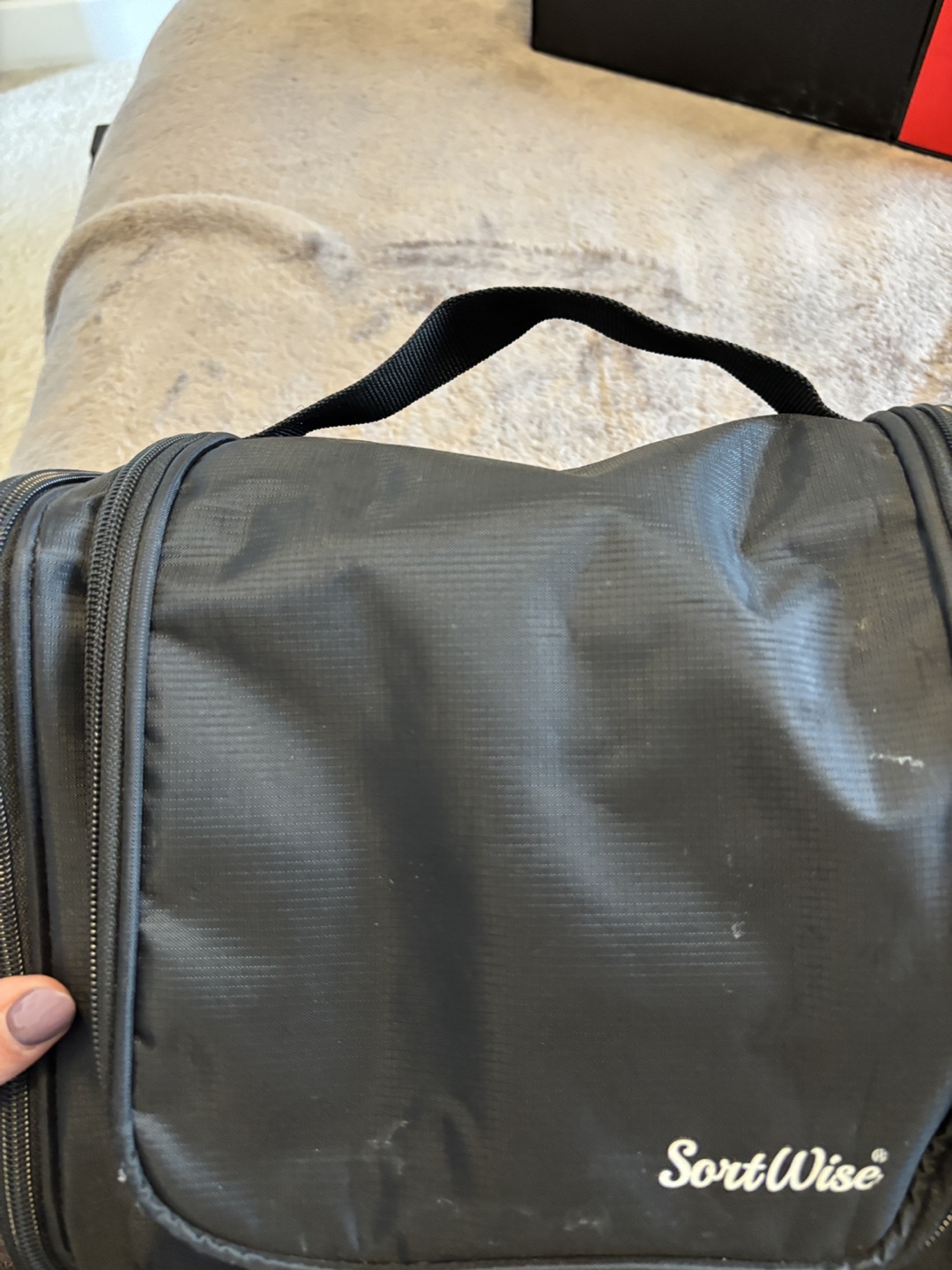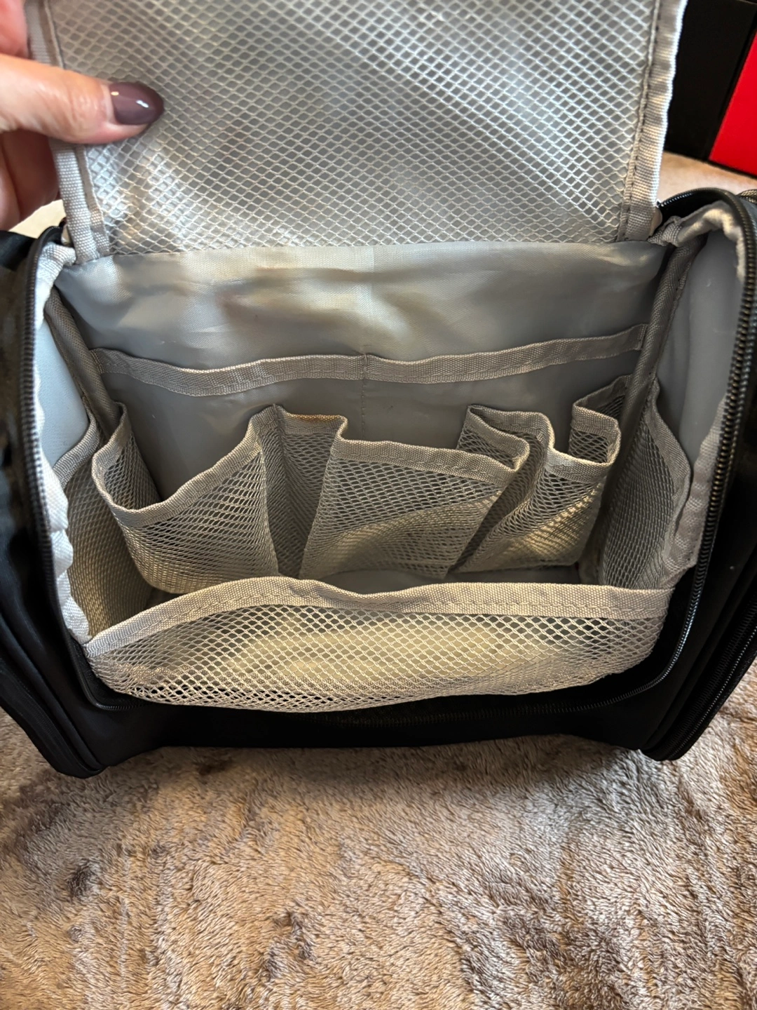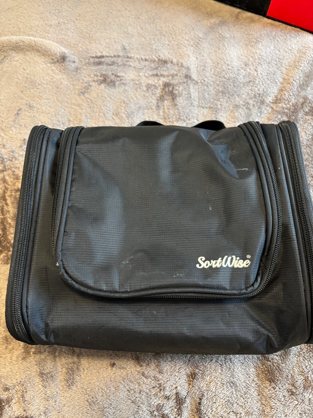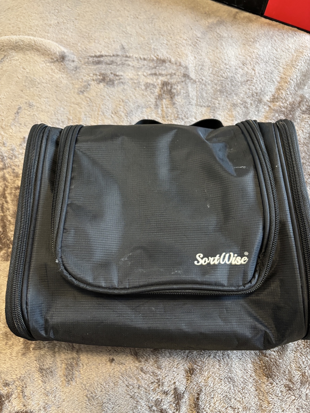 Black travel toiletry bag. Features multiple compartments and a hanging hook. Measures approximately 23cm wide x 15cm tall.