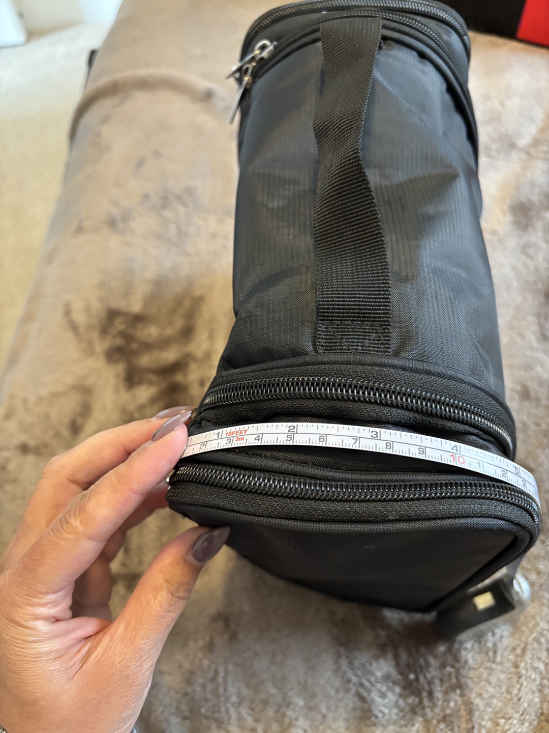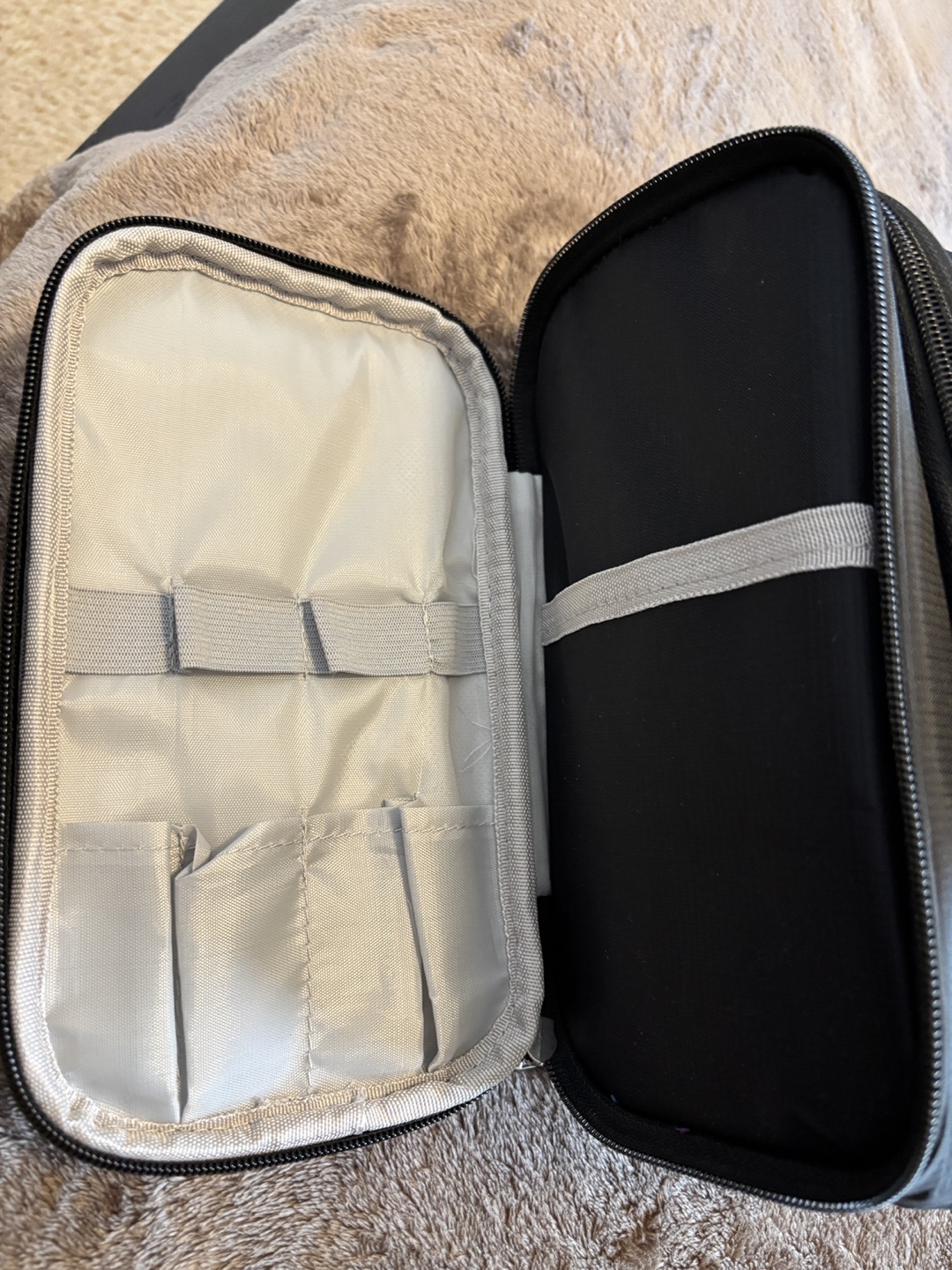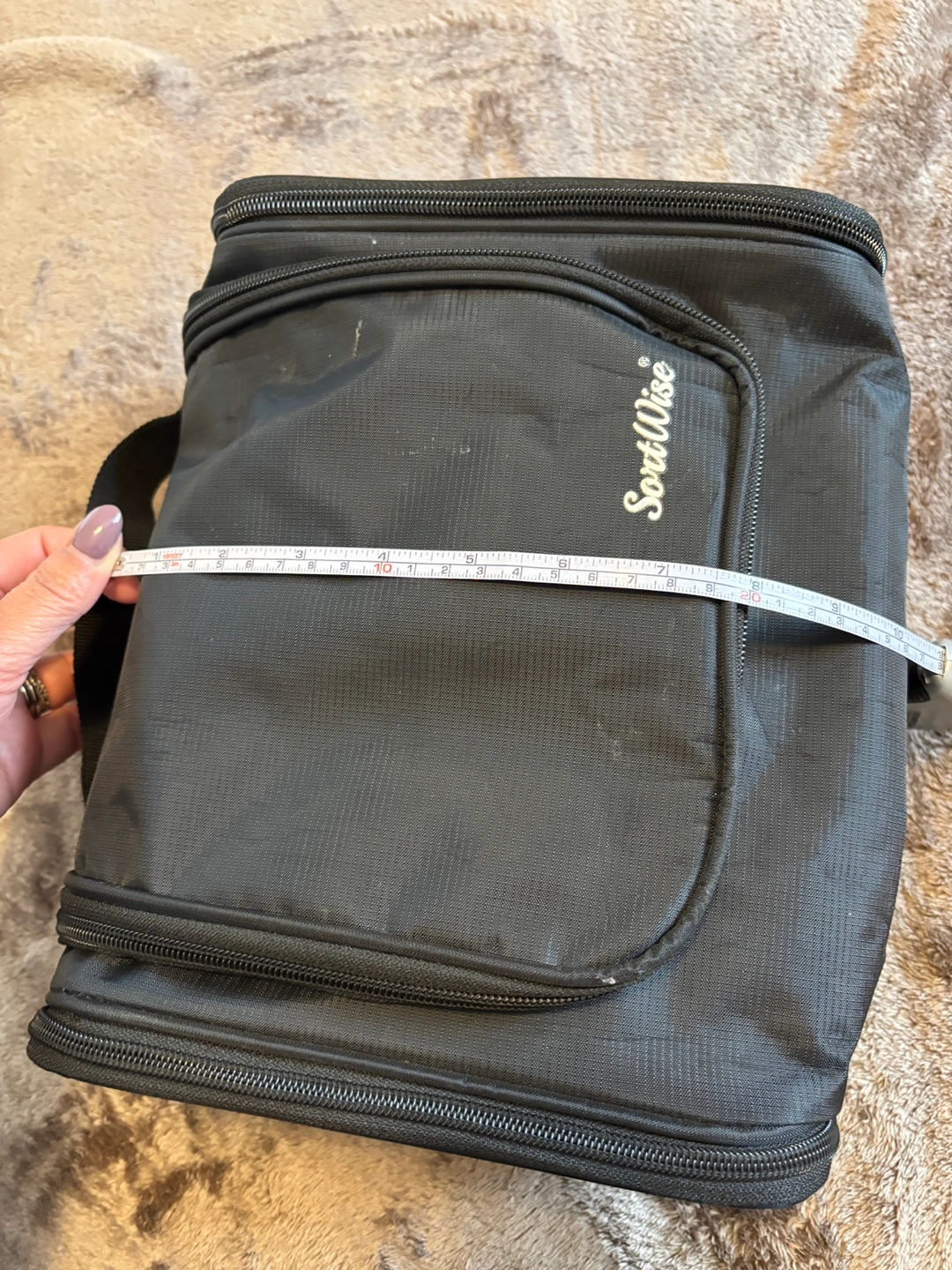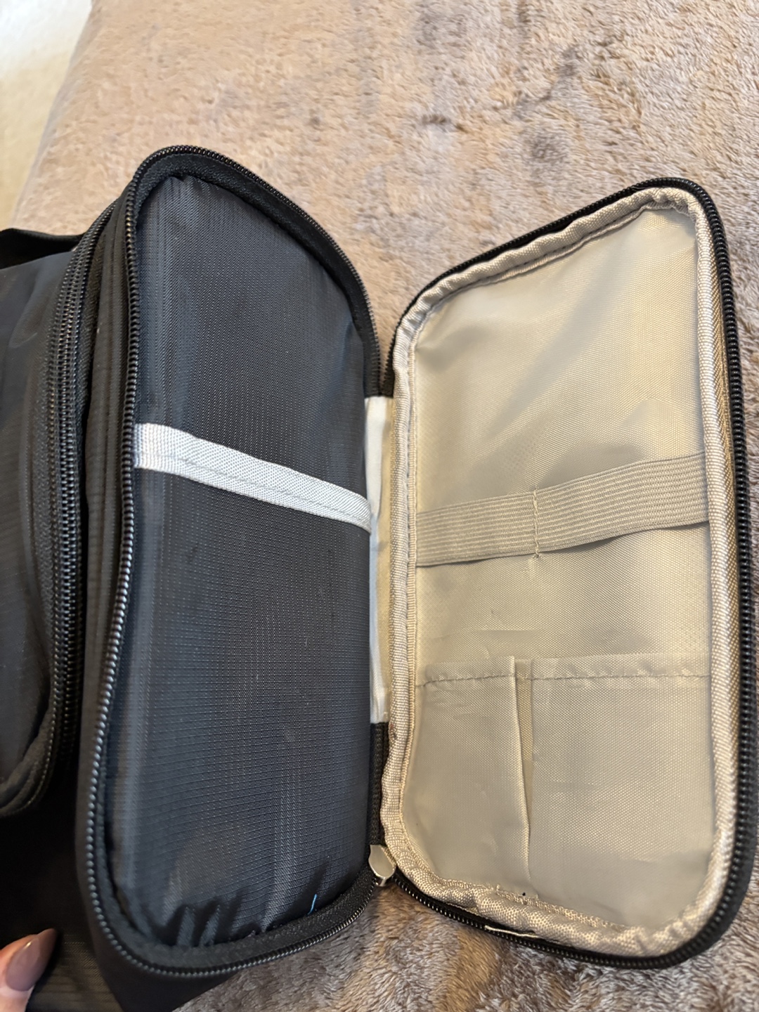 Black travel toiletry bag. Features multiple compartments and a hanging hook. Measures approximately 23cm wide x 15cm tall.