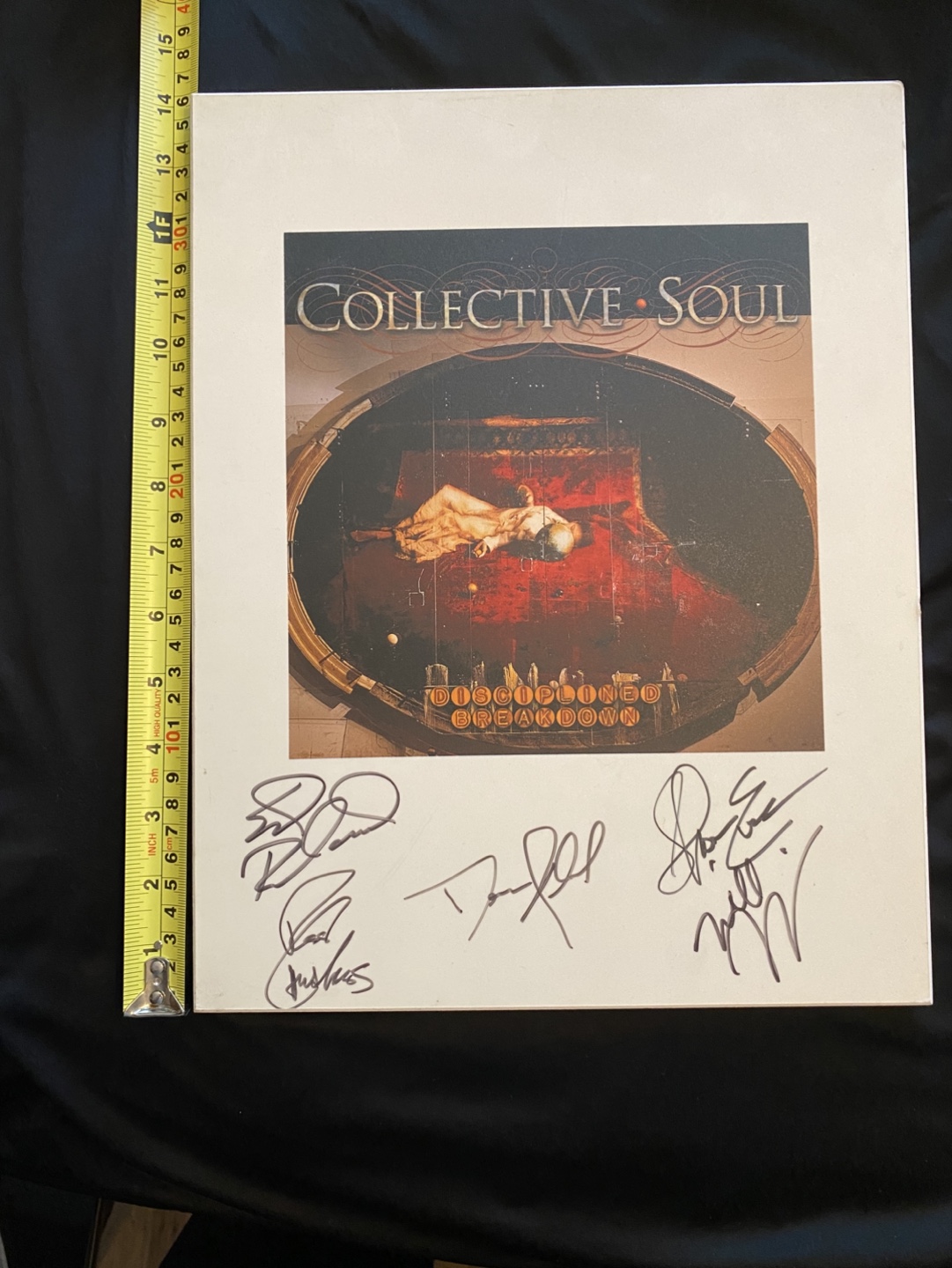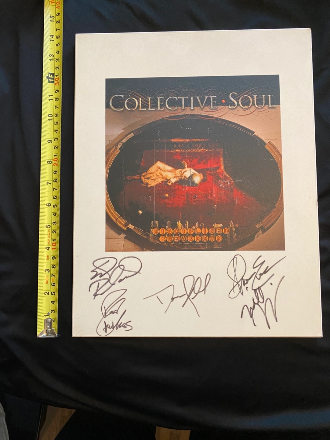 Autographed print featuring album art from Collective Soul's Disciplined Breakdown. Features five signatures. Large format. Ready to hang. Signed by Ed Roland, Dean Roland, Ross Childress, Will Turpin, and Shane Evans. From their 1997 Album Disciplined Breakdown