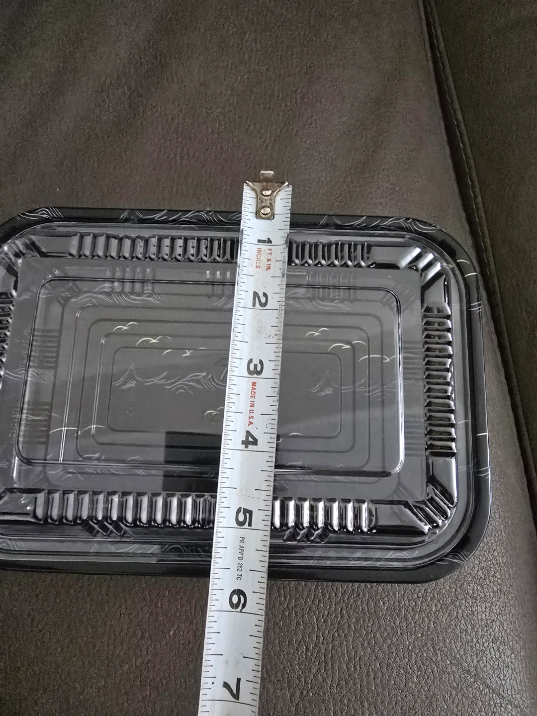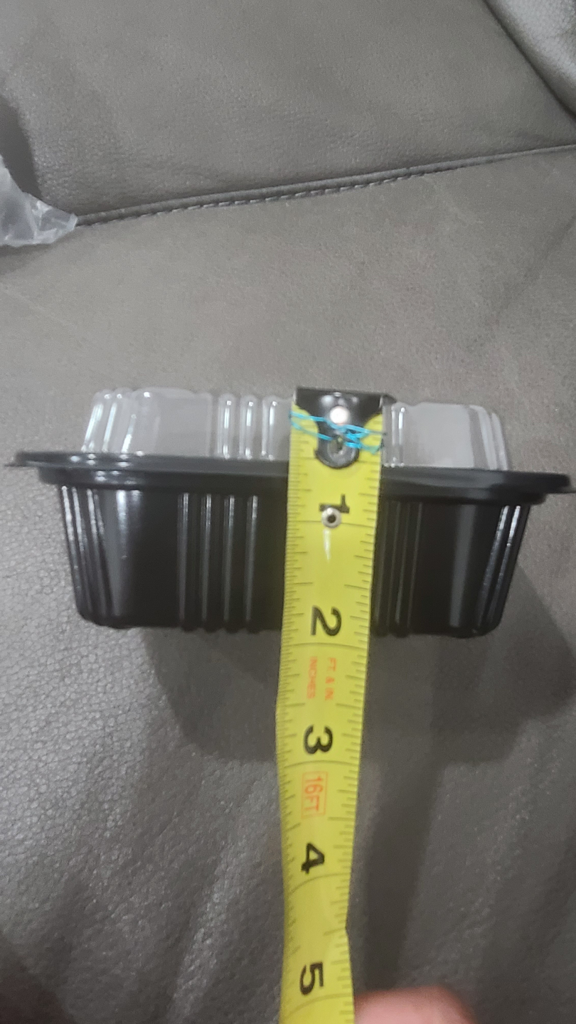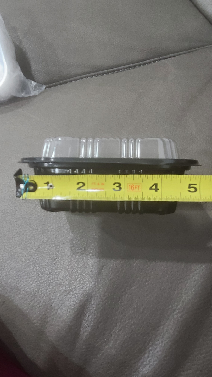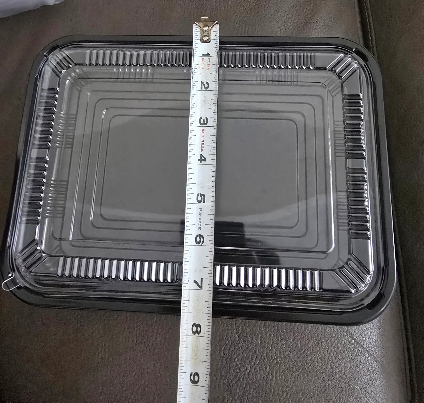 50 black plastic food containers. Each includes a clear plastic lid. Approximately 4 inches long and 3 inches wide. Perfect for leftovers or meal prep.
