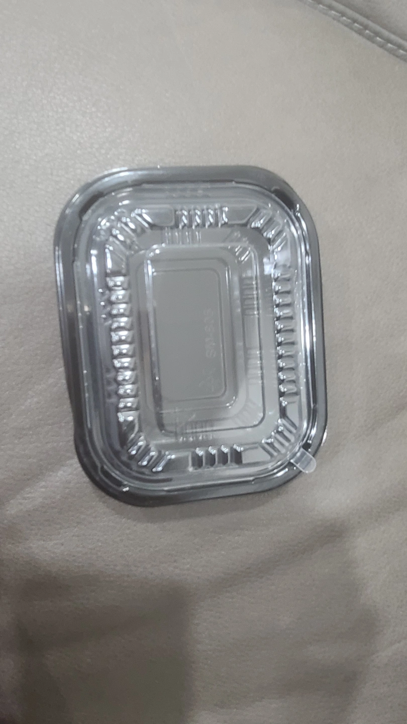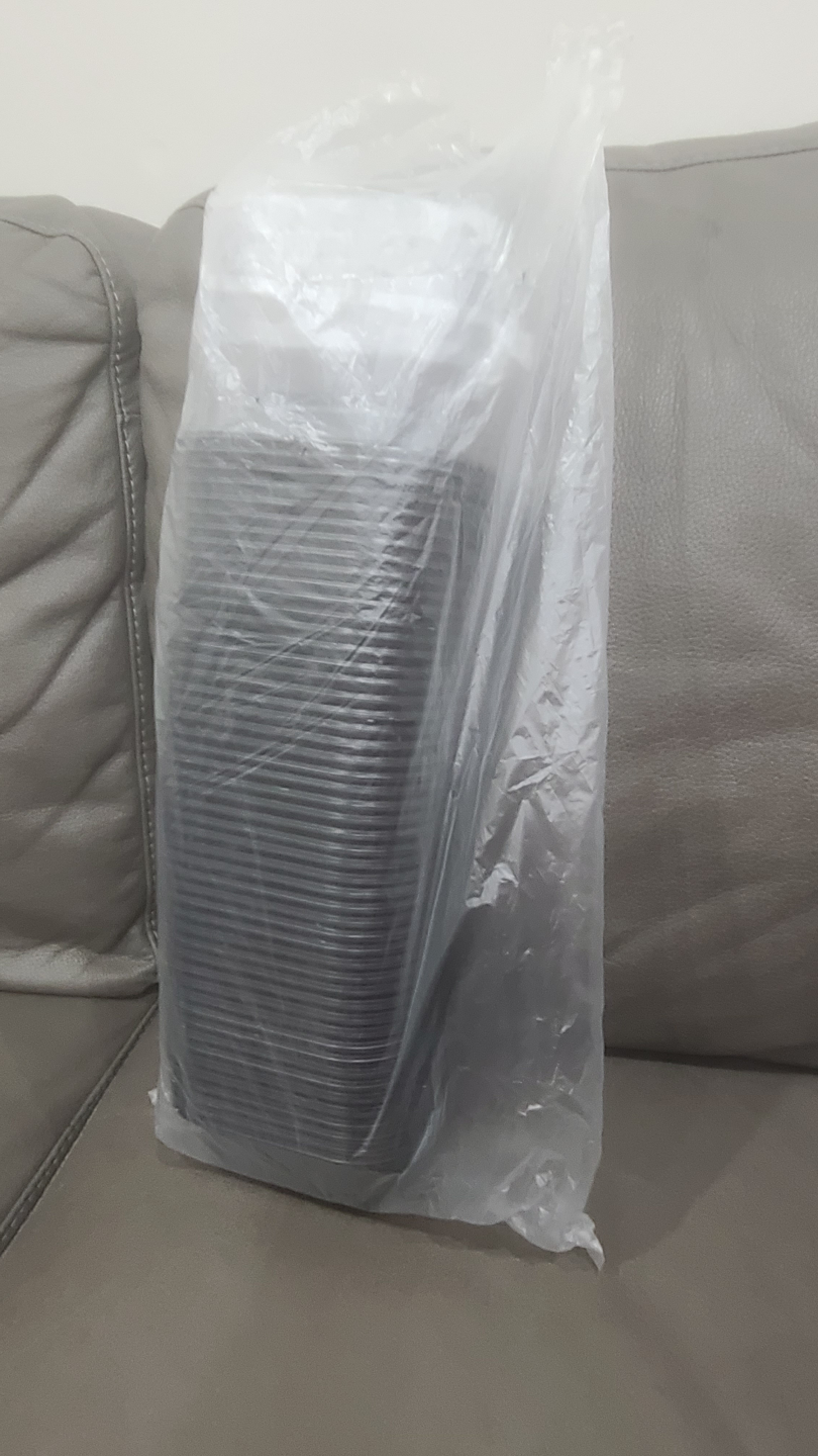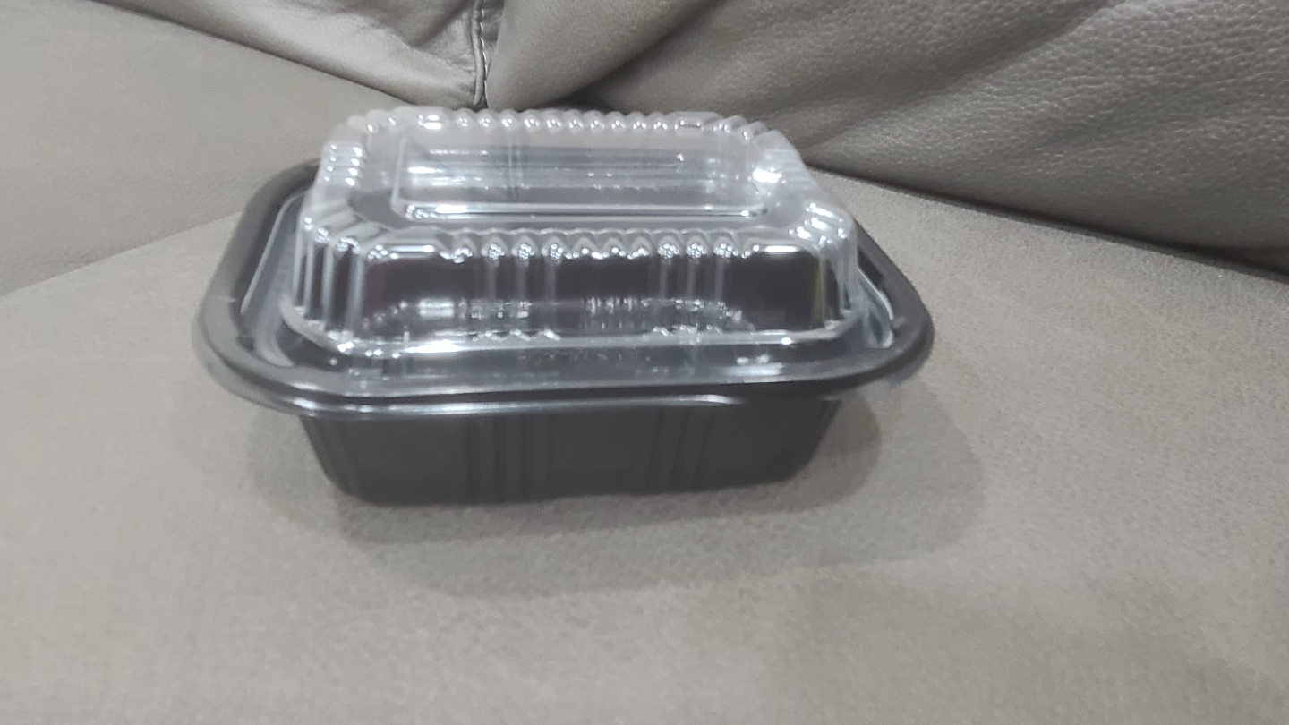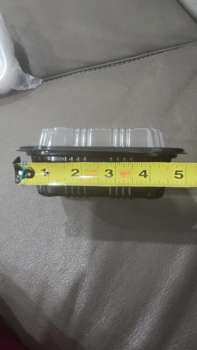50 black plastic food containers. Each includes a clear plastic lid. Approximately 4 inches long and 3 inches wide. Perfect for leftovers or meal prep.