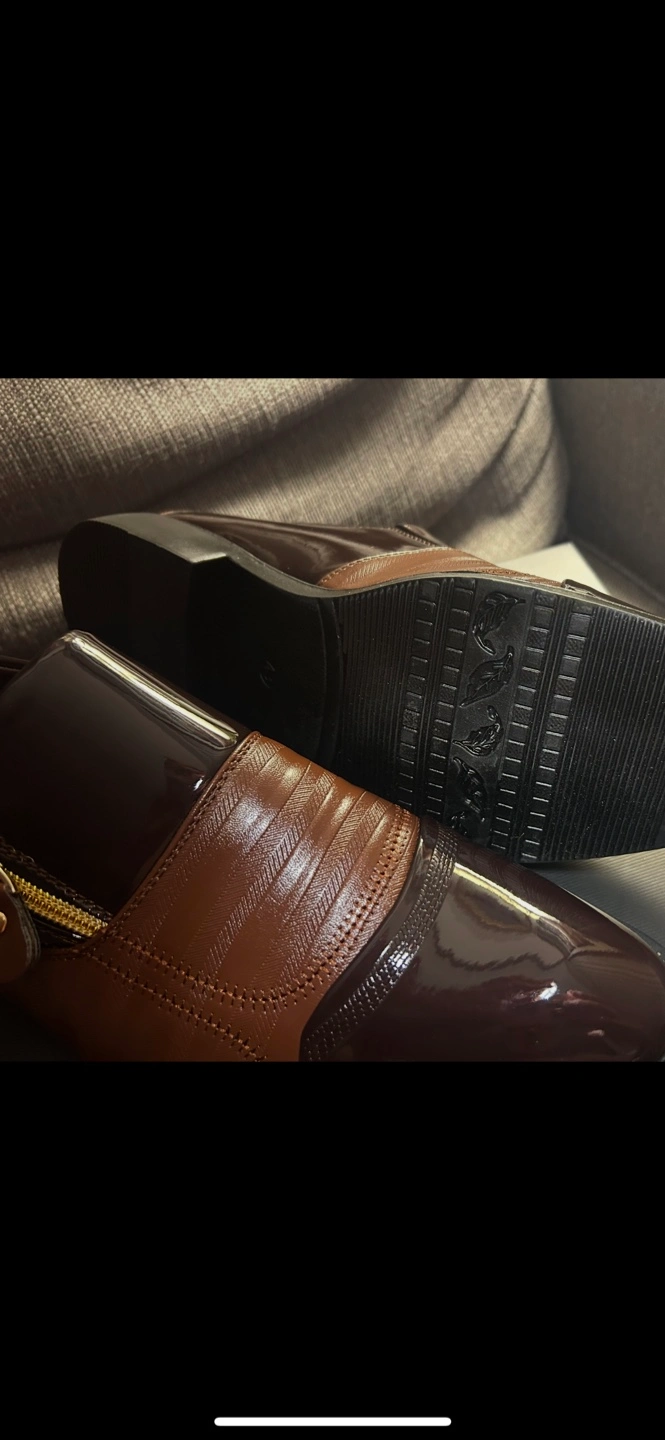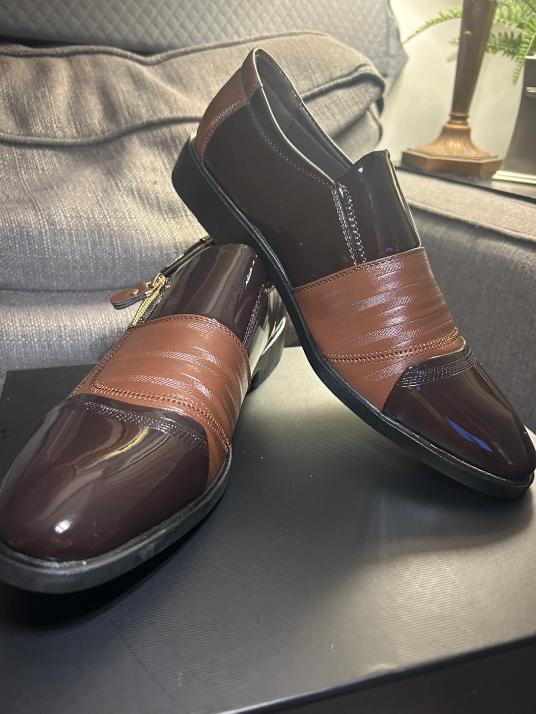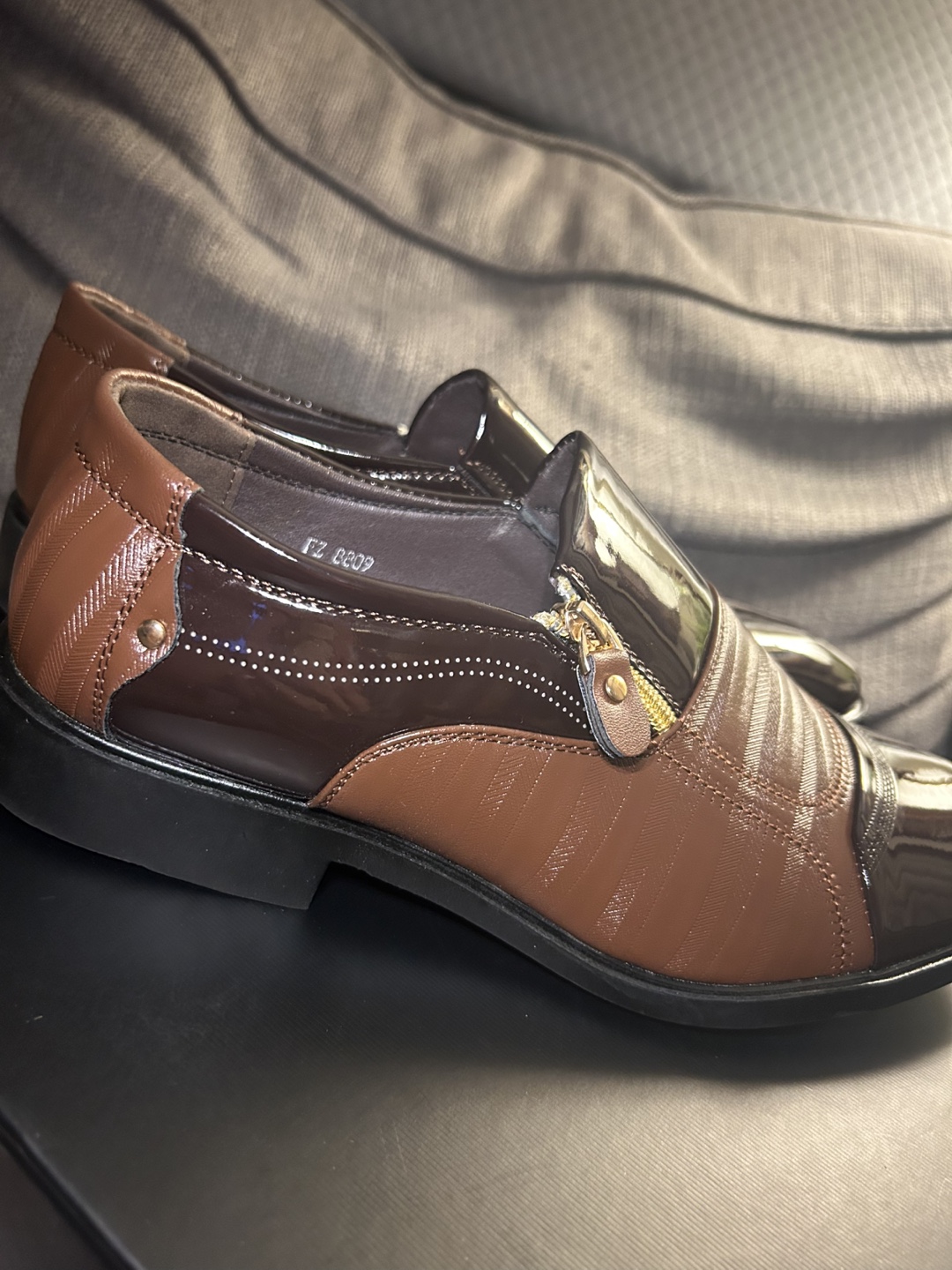 Stylish men's slip-on shoes. Brown PU leather upper with side zipper detail. Patent leather accents. Comfortable and elegant design. Great for formal occasions.