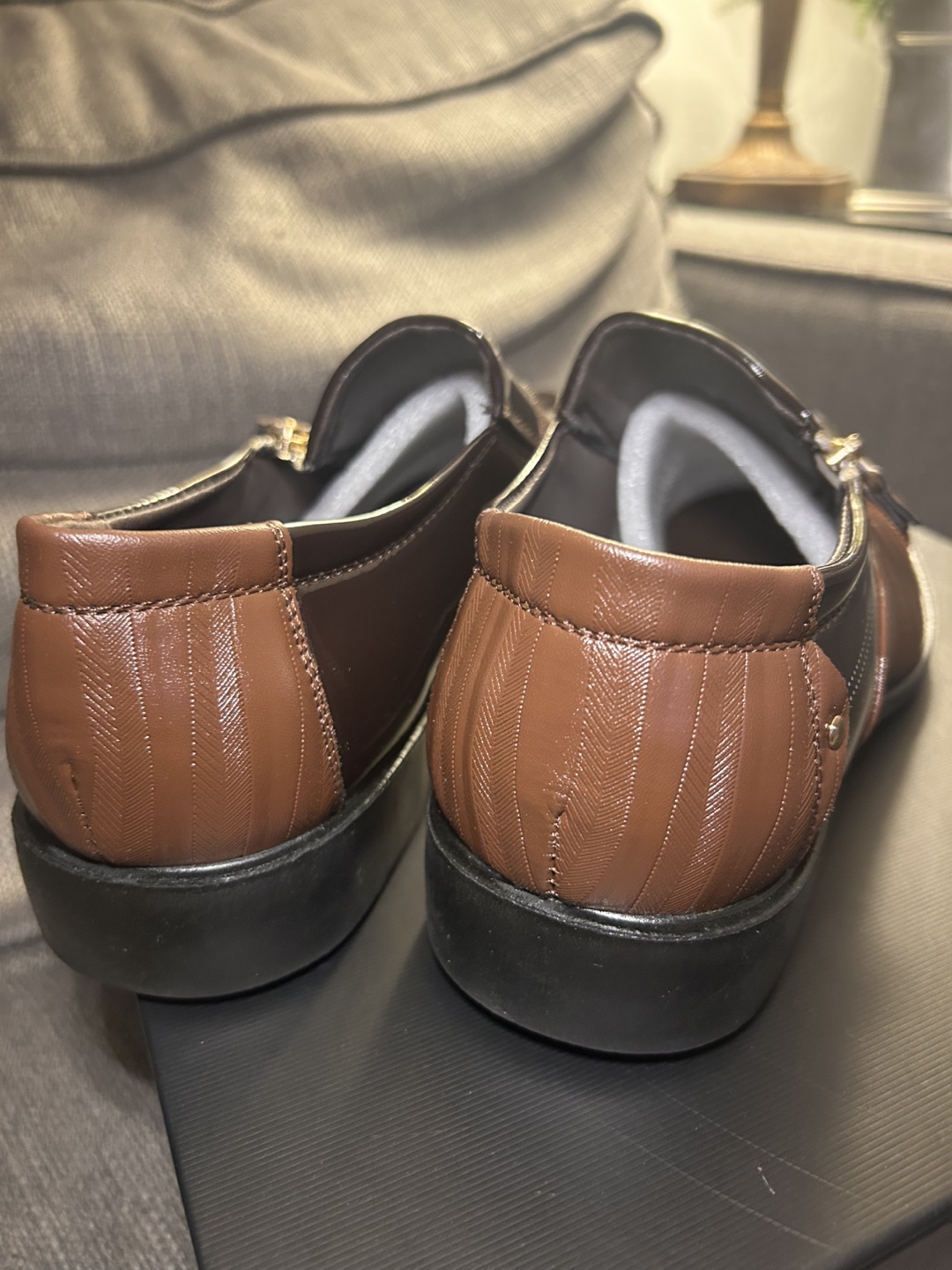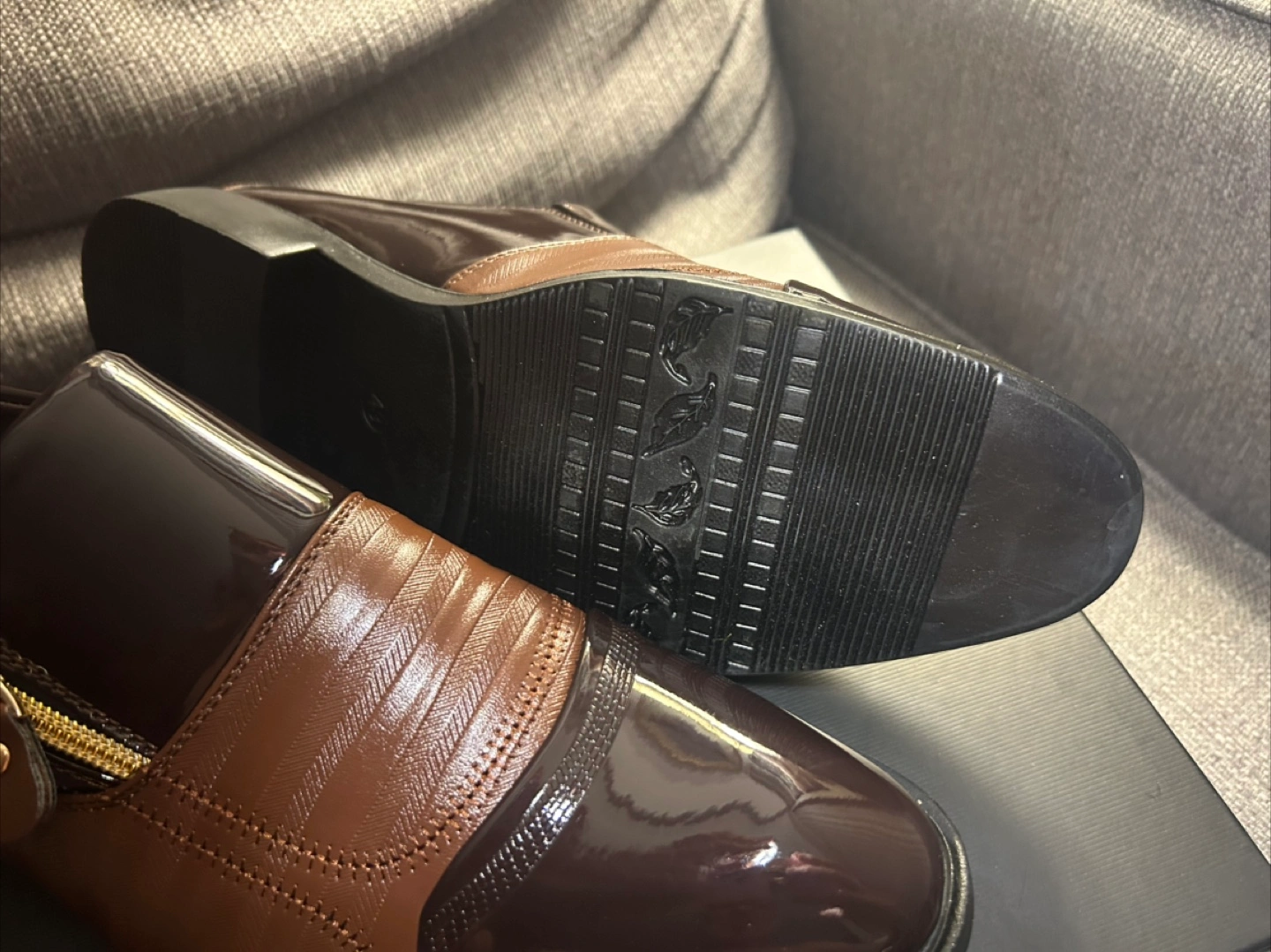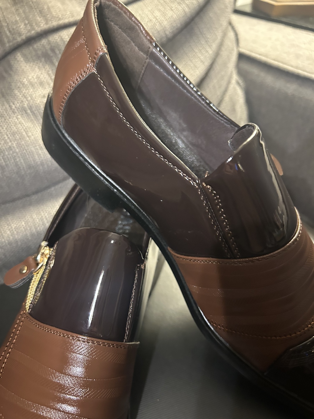 Stylish men's slip-on shoes. Brown PU leather upper with side zipper detail. Patent leather accents. Comfortable and elegant design. Great for formal occasions.
