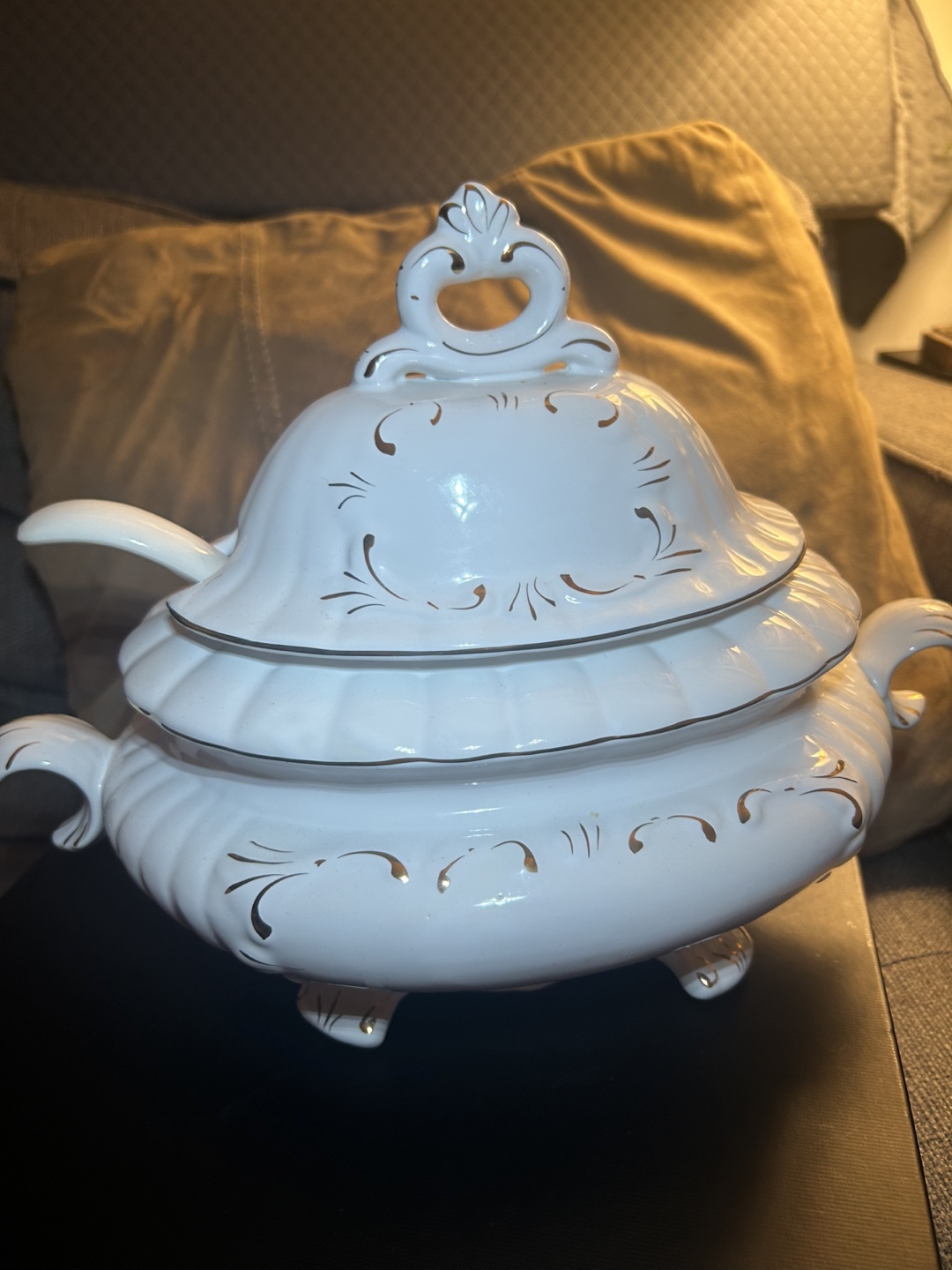 Vintage White and Gold Tureen with Ladle