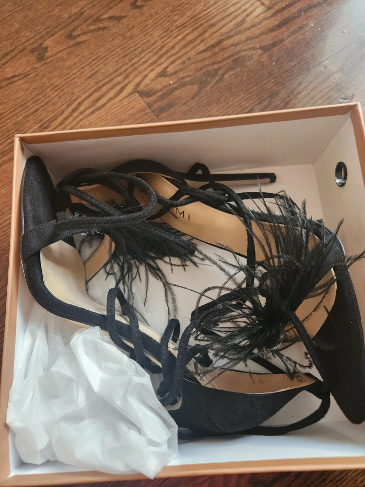 Stunning black suede heels. Feature delicate feather detailing and lace-up ankle closure. High heels. New in box.