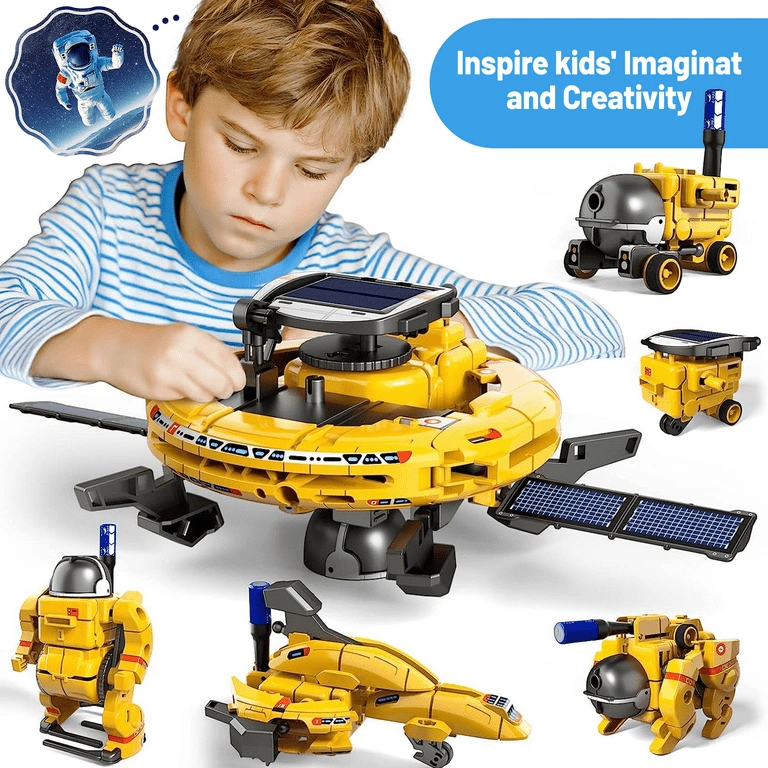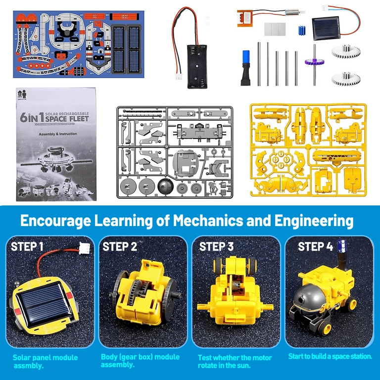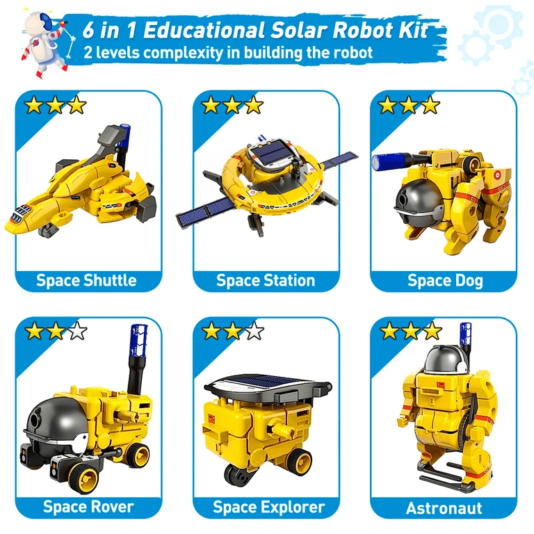 STEM toy. Solar-powered. Build 6 different space robots. Includes instructions. Great for kids. Develops mechanics and engineering skills. Fun and educational.