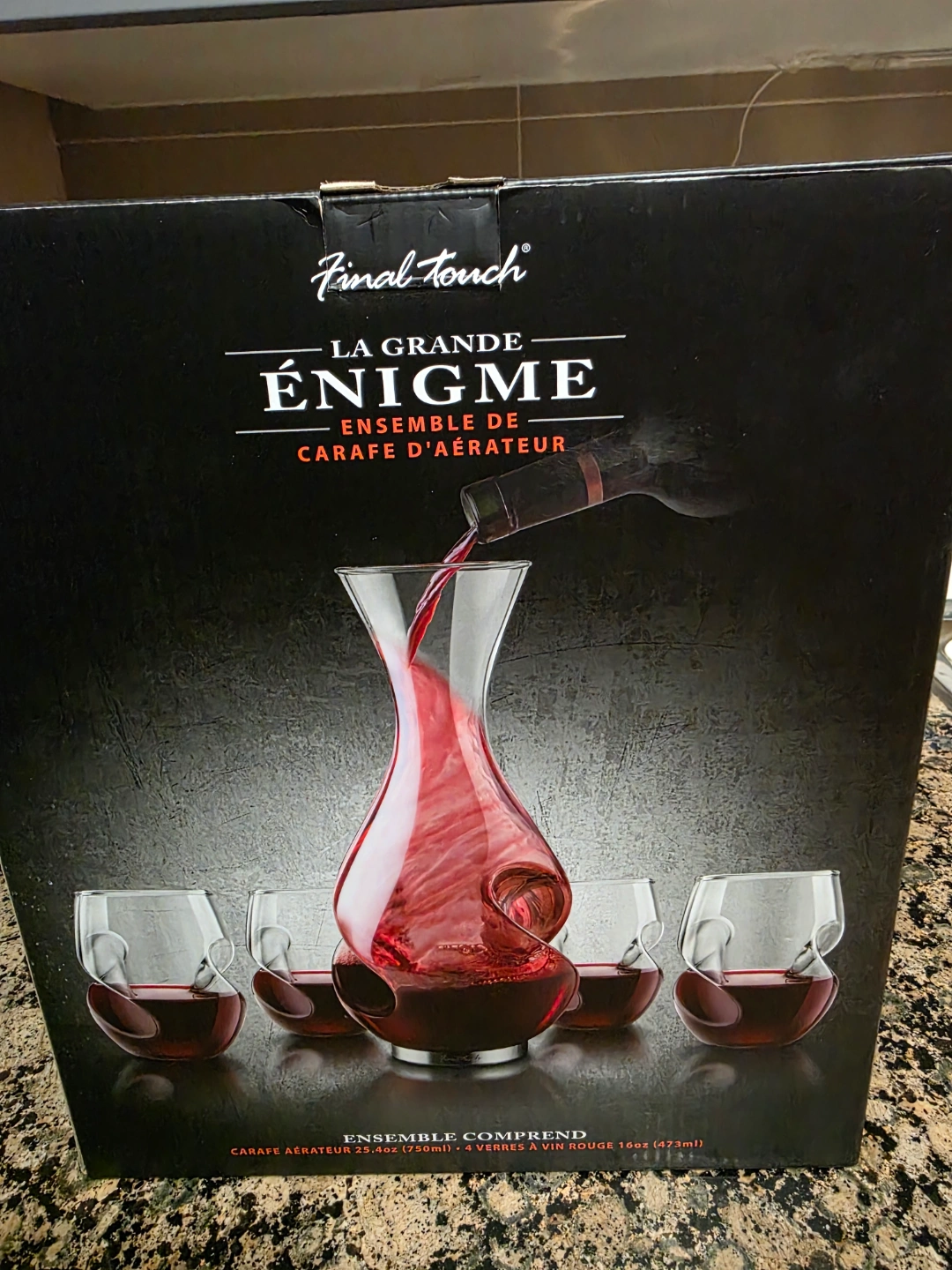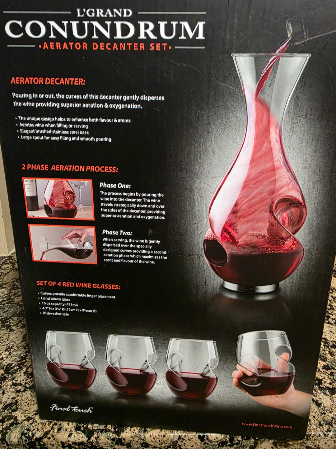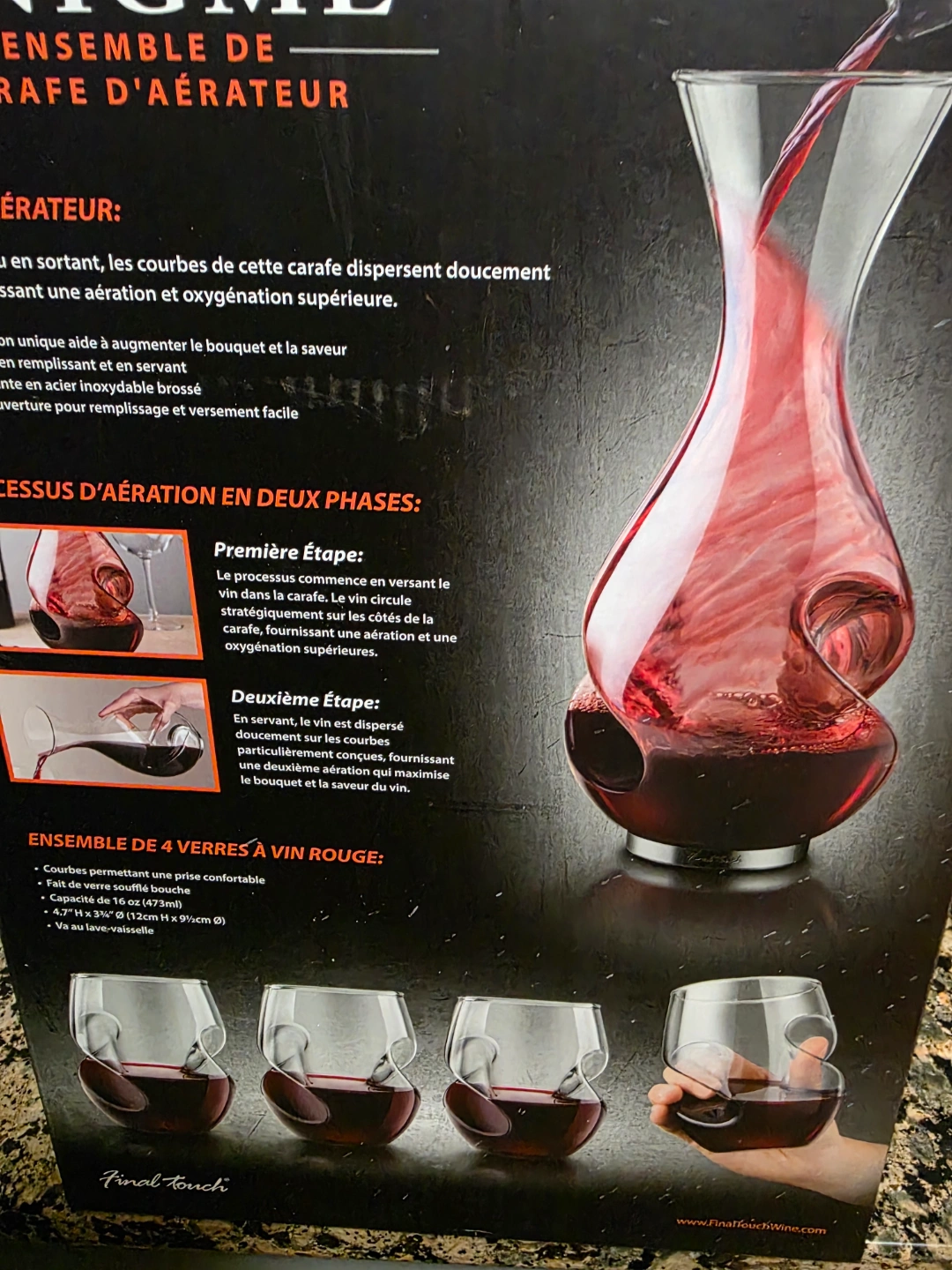 Brand new in box. Includes decanter and four uniquely designed wine glasses. Aerates wine for enhanced flavour and aroma. Easy pouring and filling. Dishwasher safe.