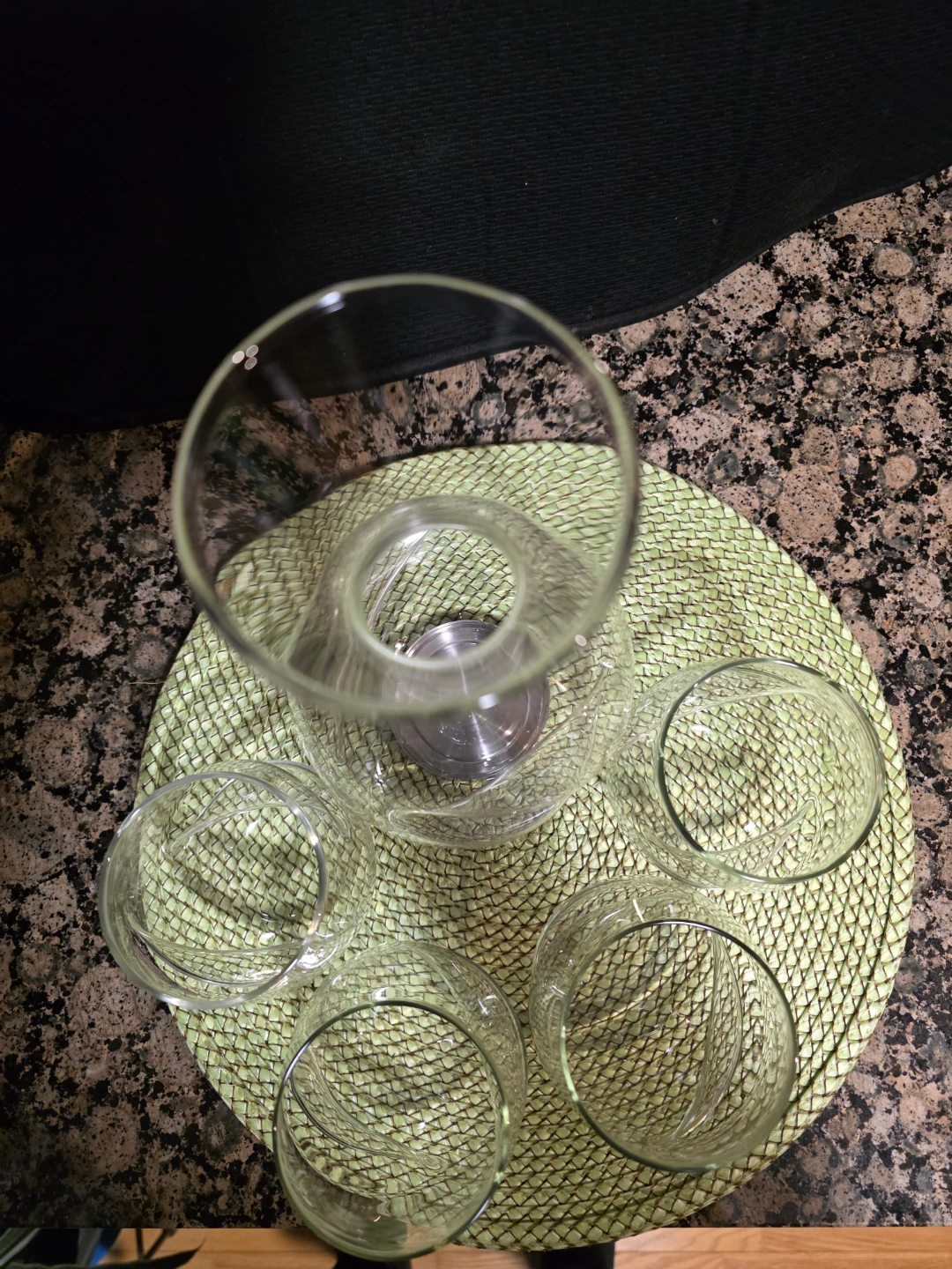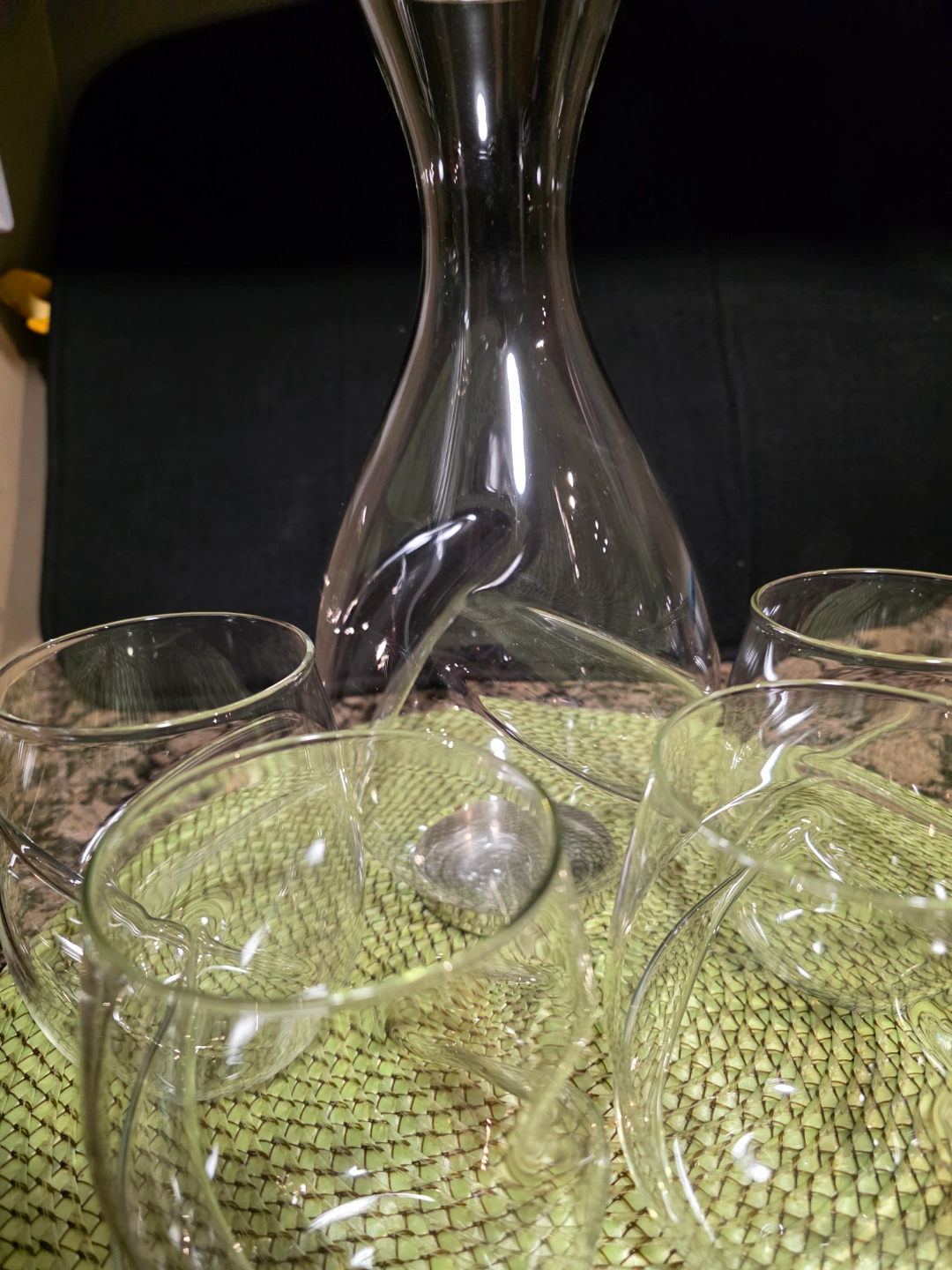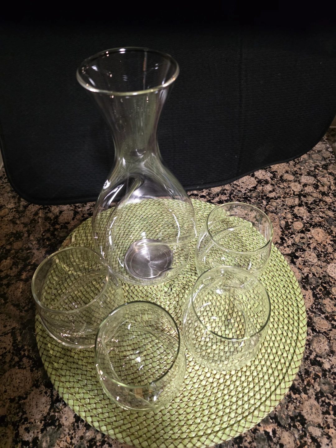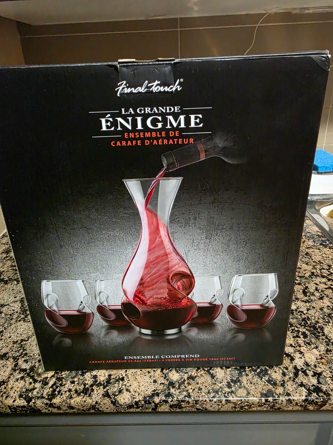 Brand new in box. Includes decanter and four uniquely designed wine glasses. Aerates wine for enhanced flavour and aroma. Easy pouring and filling. Dishwasher safe.
