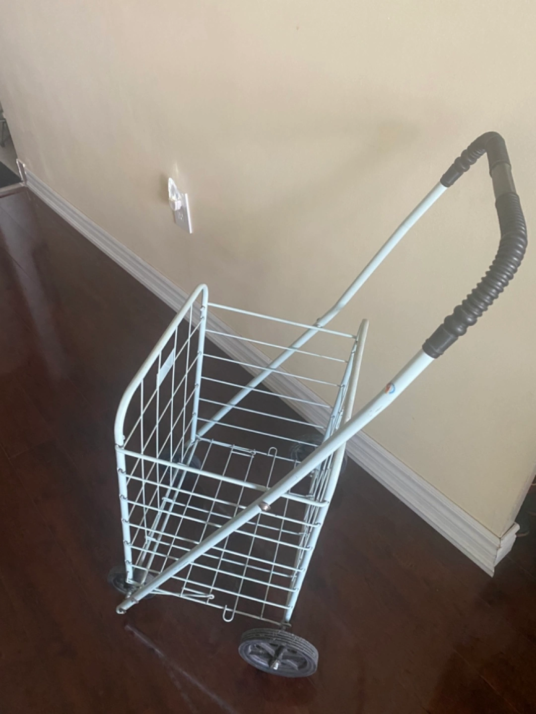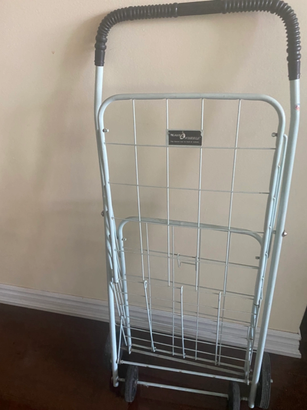 Foldable metal shopping cart. Features a wire basket and comfortable handle. Four wheels for easy maneuverability. Great for grocery shopping or hauling items.