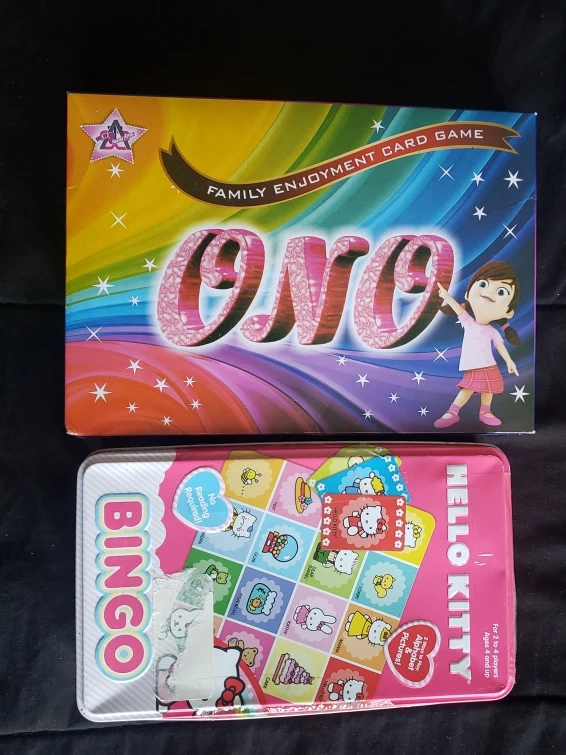 Two family-friendly card games. ONO is a family enjoyment card game. Hello Kitty Bingo features Hello Kitty characters and alphabet pictures.
