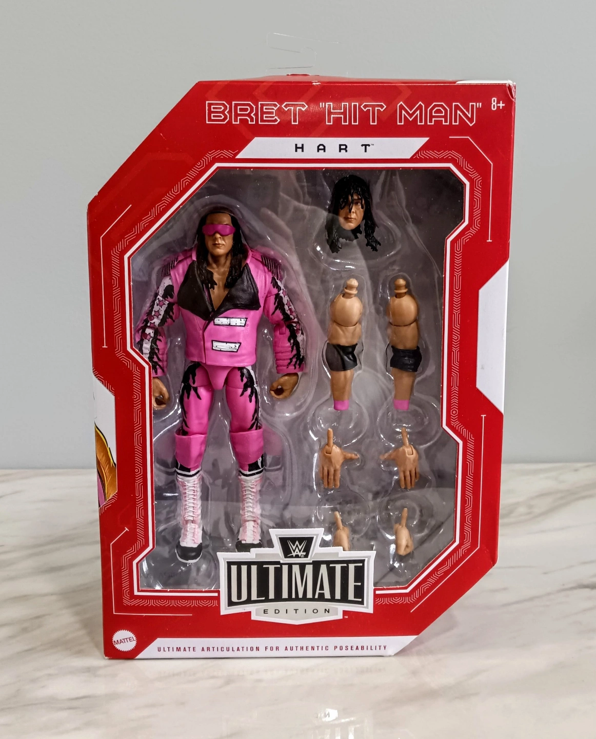 Collectible wrestling figure. Bret Hart Ultimate Edition. New in box. Highly detailed. Multiple accessories. Great for collectors.